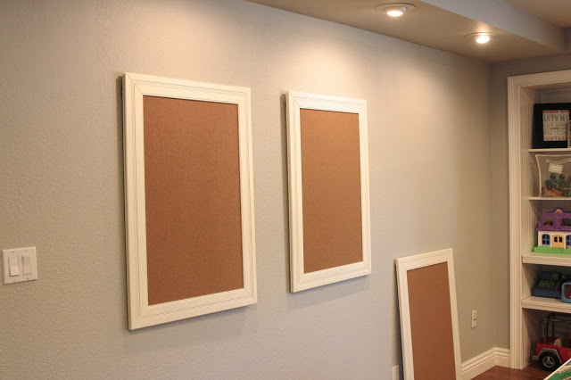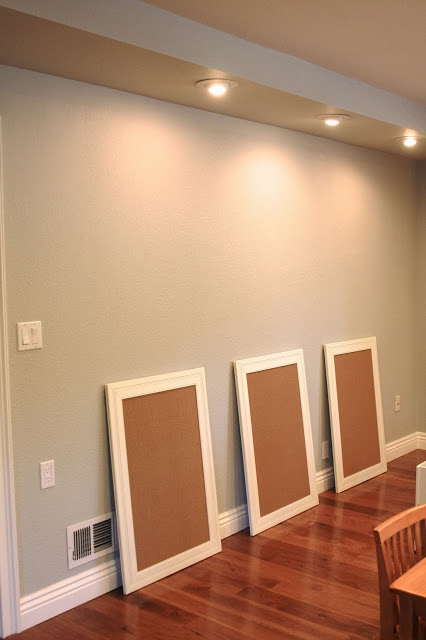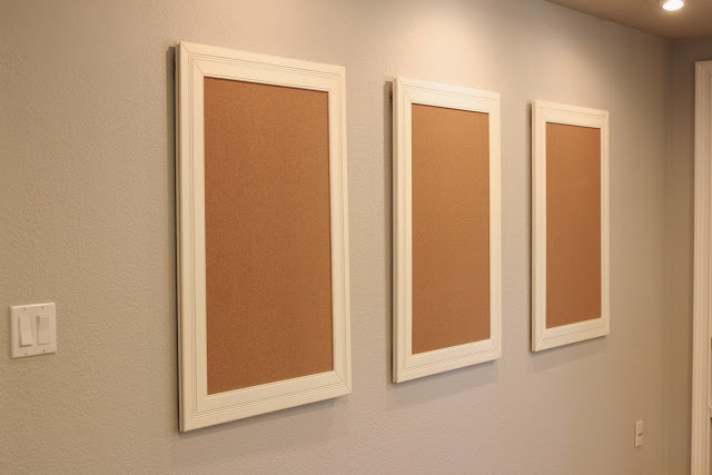 I looked into all sorts of art display options, but ended up going the simple route – 3 white framed cork boards….