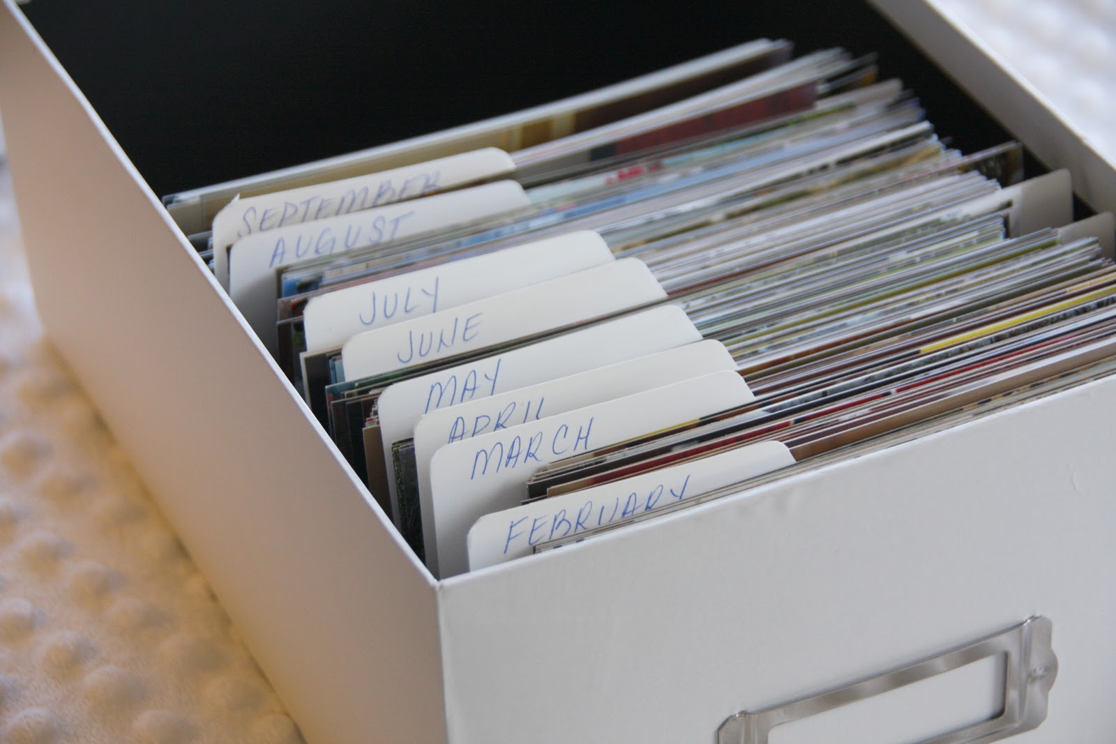 once you have a photo org system in place, putting away any photos you print shouldn’t take you more than 20 minutes. today it took be about 15 minutes to sort and put our photos into the photo box. that was it. a very quick one-a-day!