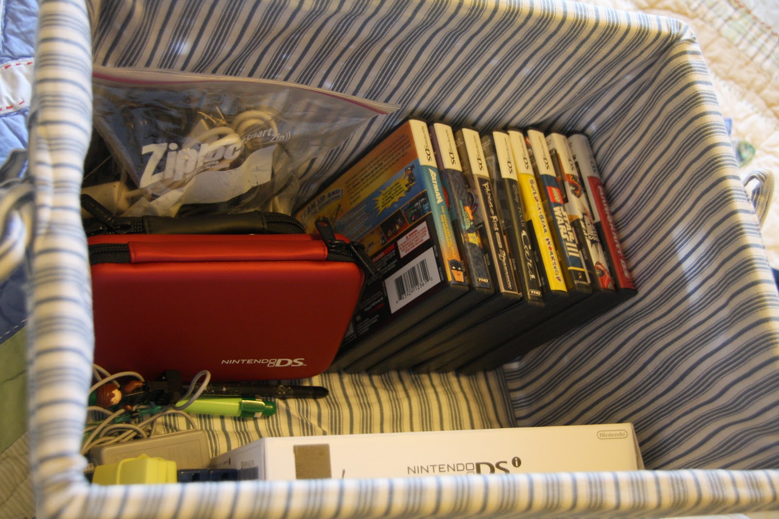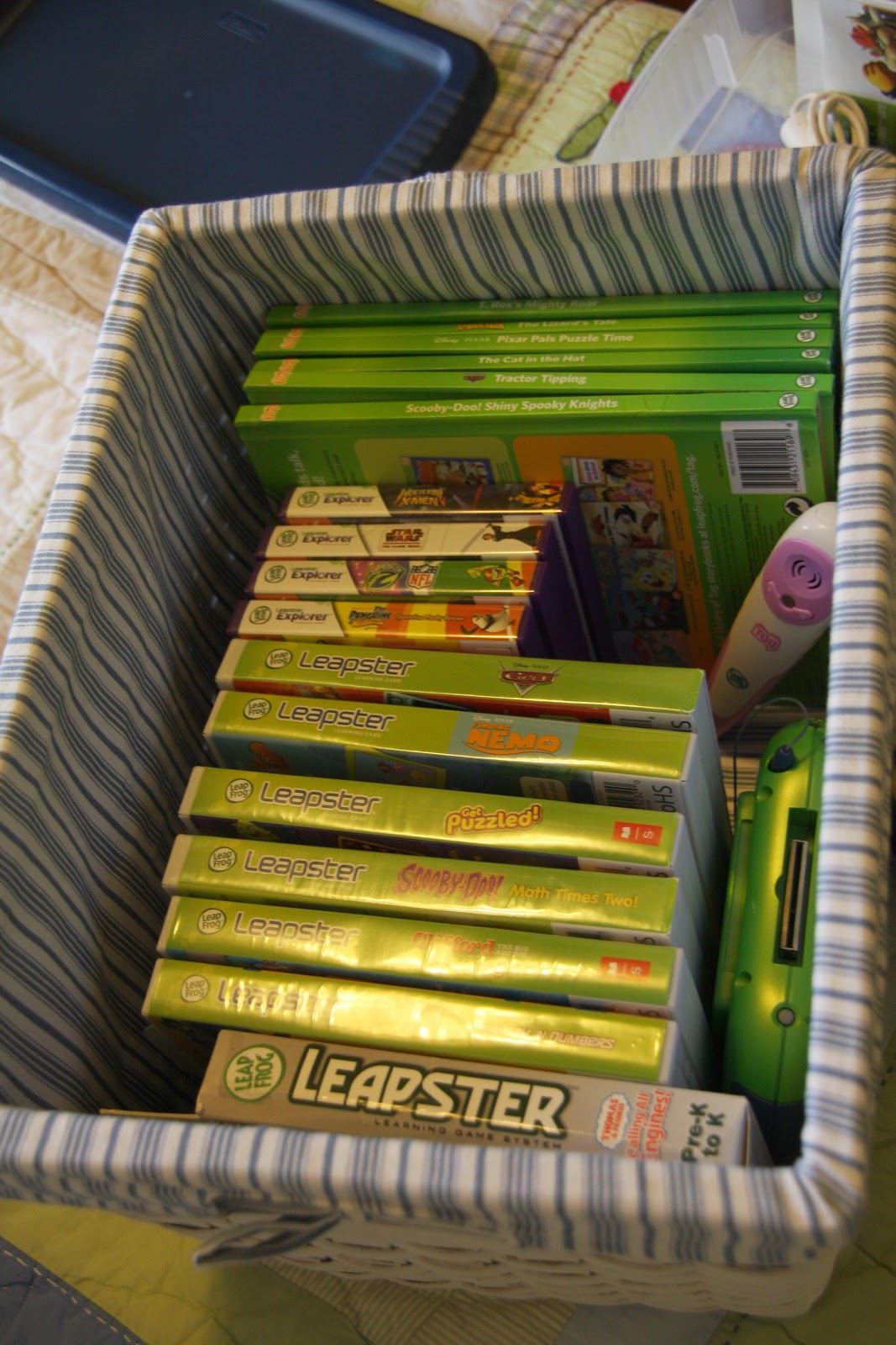 sooooo, what did i do with those 2 empty shelves in our 5 year old’s bedroom? i located 2 baskets i had put away for re-purposing. initially, i had planned on using them for all of the smaller board books our daughter likes to read, but then the thought occured to me this would be a great spot for the boys electronics…our tag reader systems and tag books, our Leapster and games, our Leapster 2 and games, and our DSi, games, and accessories…..