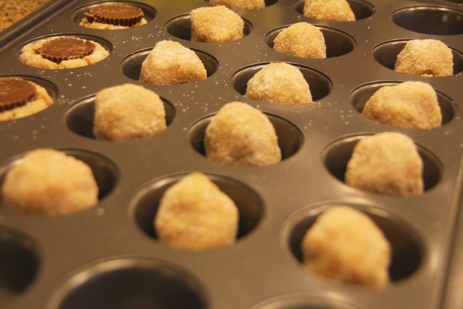 then we added more dough balls and the peanut butter cups to a mini-muffin pan…