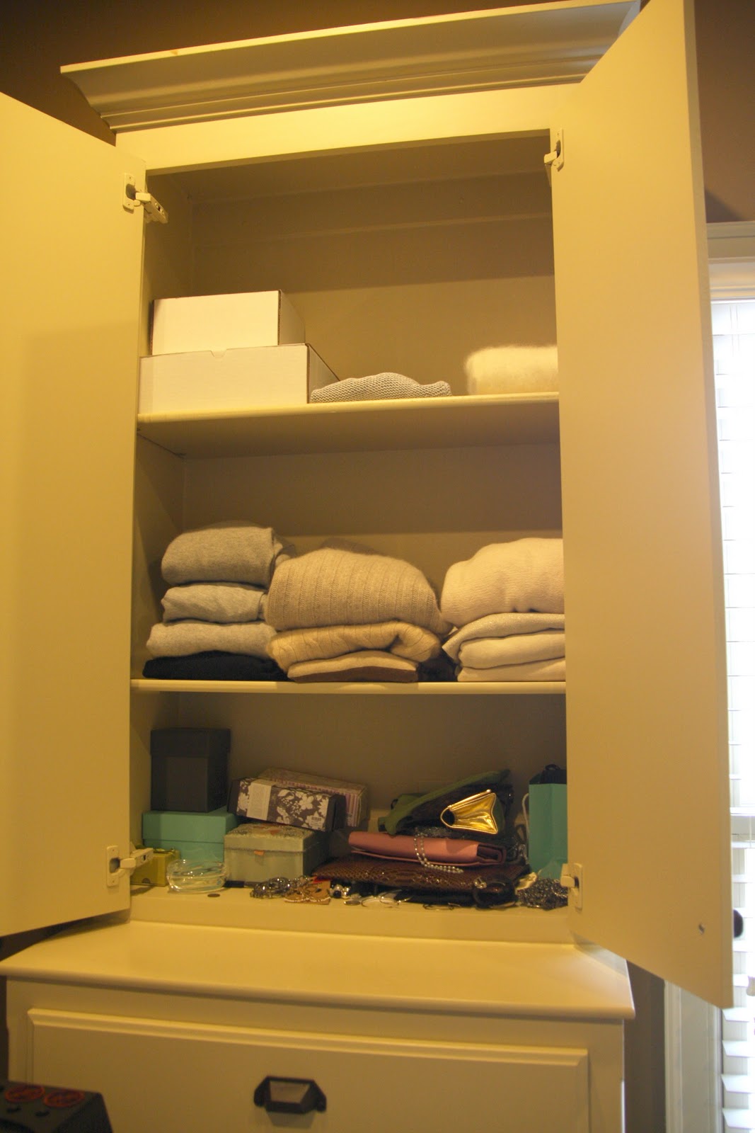 inside the cabinets i keep sweaters that i don’t want hanging or exposed to dust. and there is a shelf with my jewelry and small handbags…
