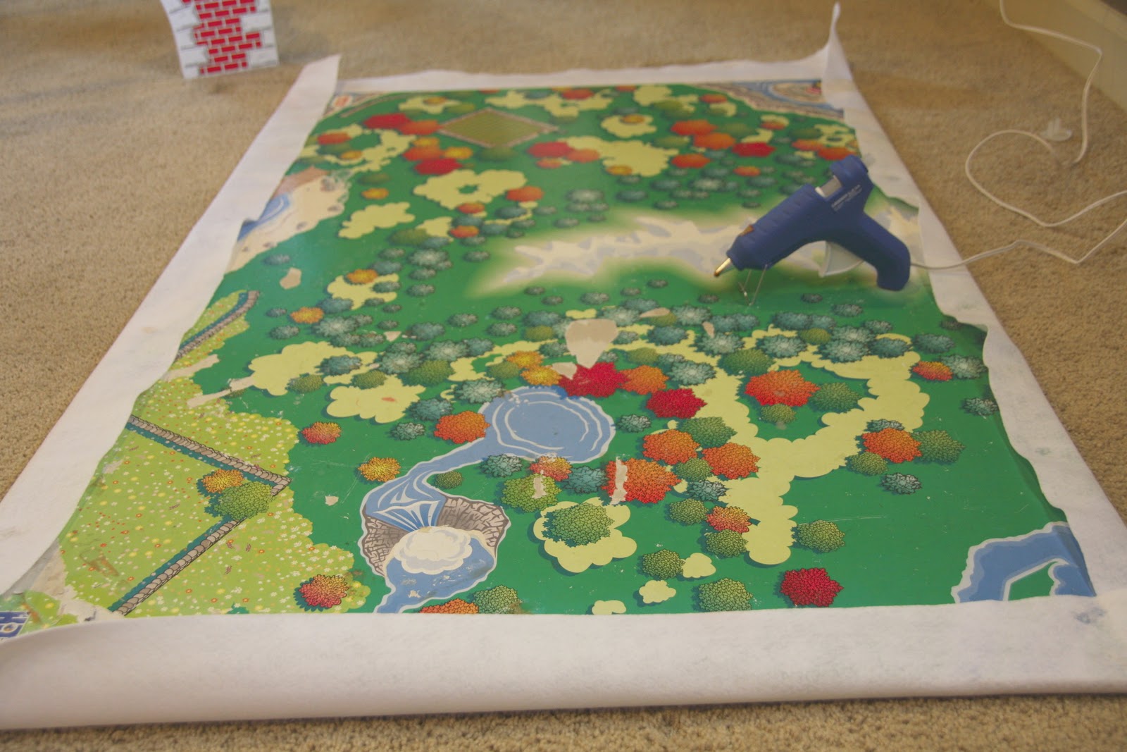 glue gun glue is VERY easy to remove, so this will in no way harm the tabletop. that means when we are ready for a train table again, all i need to do is carefully remove the felt.