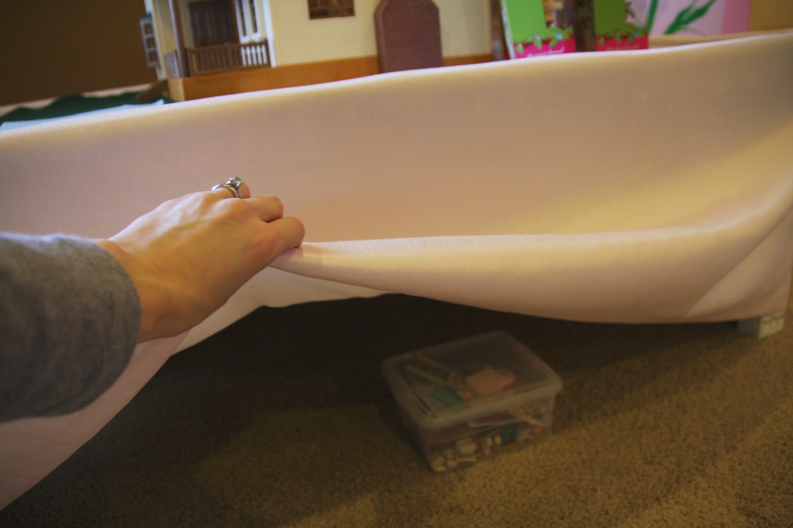 i realize how tiny that container is. as you can see all of those pieces are super small, so this container is going to do the trick for a while. if and when we need a bigger bin, it will fit perfectly under the table and the curtains will keep all of that eye-clutter hidden away.
