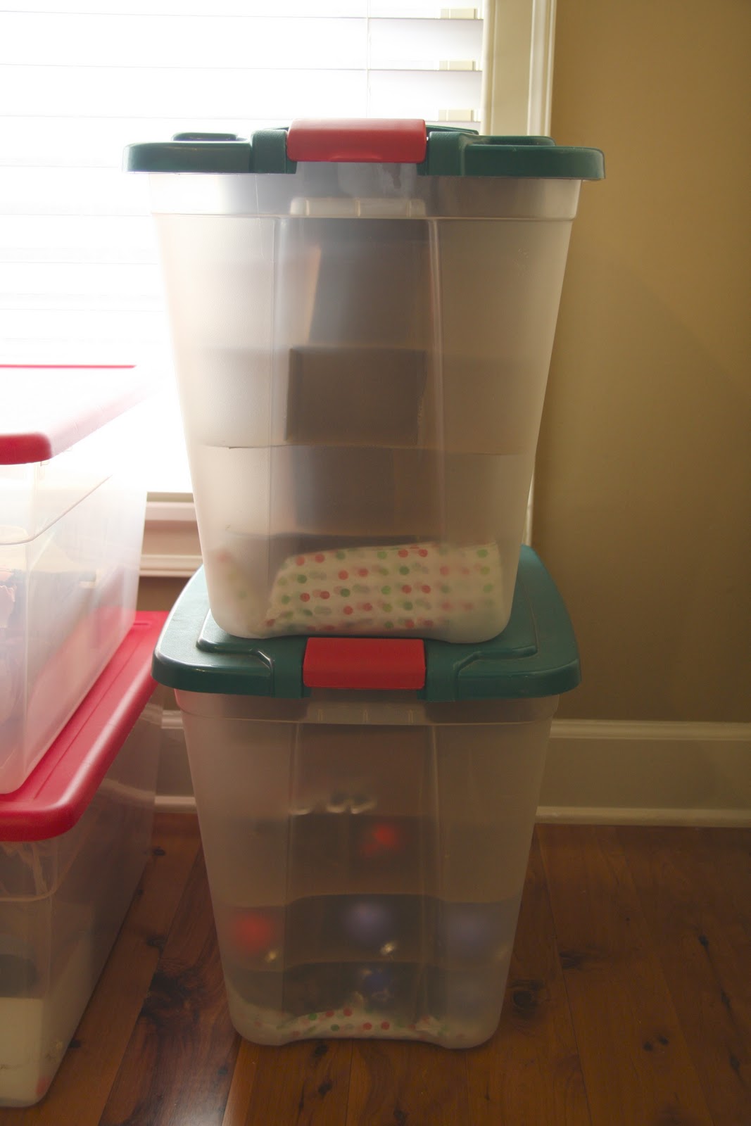 and these bins (also from target) safely hold ornaments and have a green and red lid….