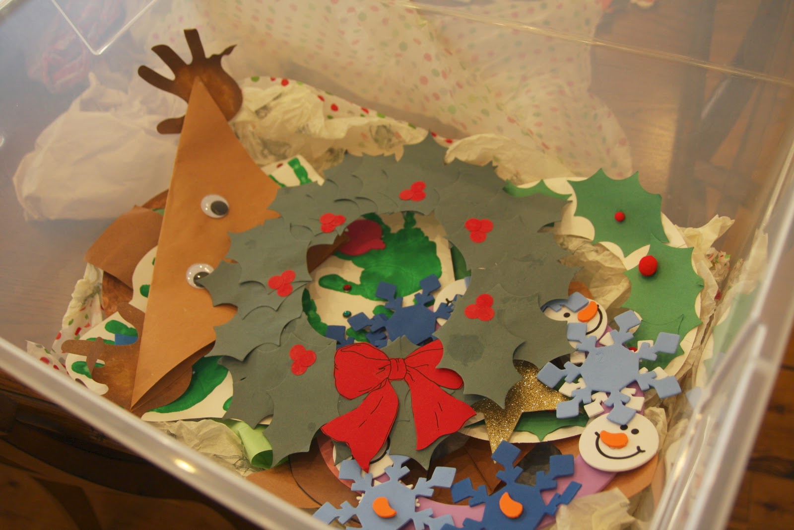 i wrap each of the santa frames in tissue paper before placing them inside the bins. i also lay the artwork in between layers of tissue paper to keep them safe….