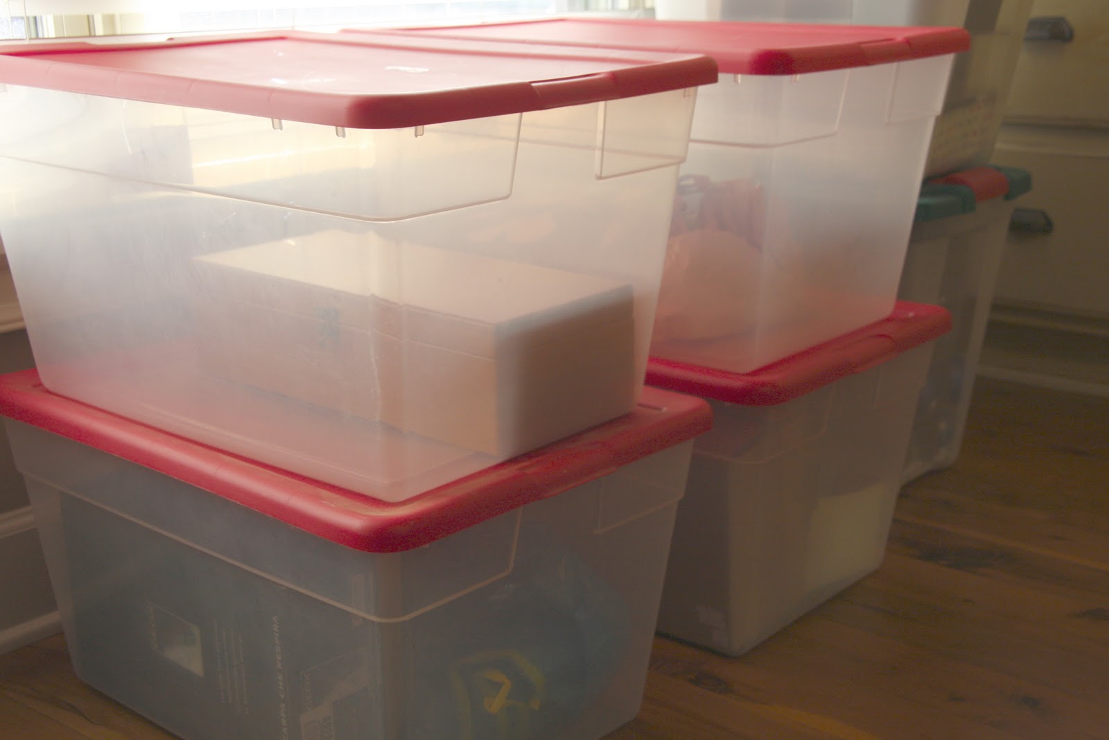 speaking of bins, a simple idea that works for us is having color-coded bins for each holiday. for example, these bins (from target) are great because they have a red lid. a red lid to us denotes Christmas decor….
