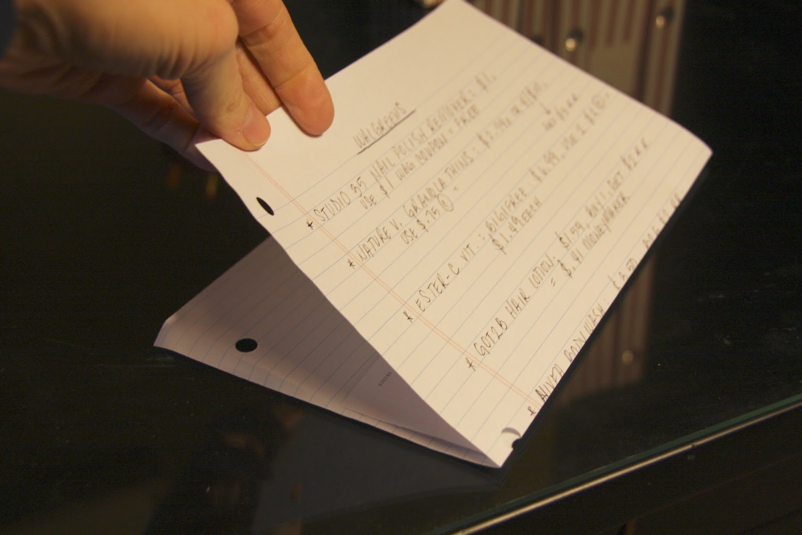 while browsing a coupon blog, the first walgreens item that caught my eye was a FREE bottle of nail polish remover. i wrote down the brand name of the polish remover, followed by what the sale or regular price of that item is. that way when i’m in the store and find that brand, to quickly find the item i look at the price or the sale price sticker listed on the shelf. next, i list out the coupons i will be using for that item, and follow that with what my total cost should come to.