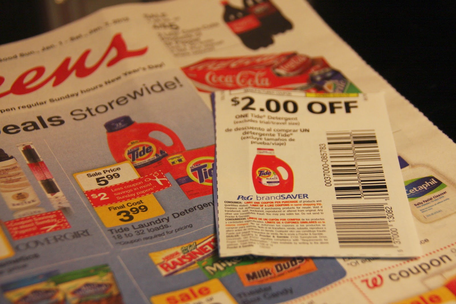 i continue browsing the ad and flipping through my coupon binder to see if i have coupons for that item. here i found tide on sale for $5.99. i have a $2 coupon which means i’ll pay just $3.99 for laundry detergent…