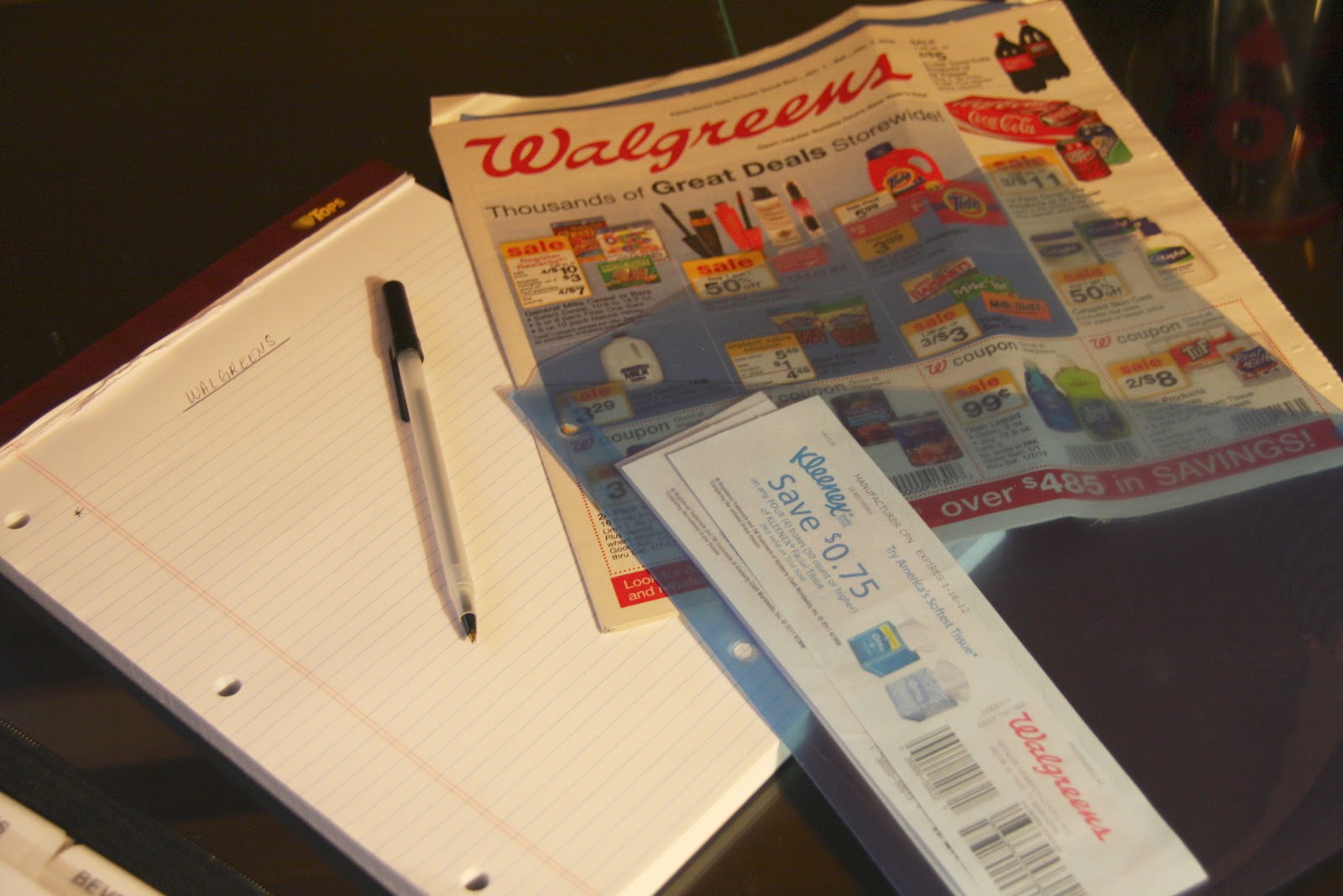 i started with my walgreens shopping list. i grabbed this weeks walgreens ad along with my plastic folder used for holding other random walgreens coupons i’ve accumulated (see that binder post for more info)….