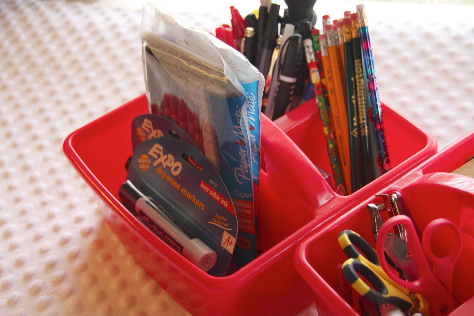 this caddy has pens, pencils and sharpies – will be up high out of reach…