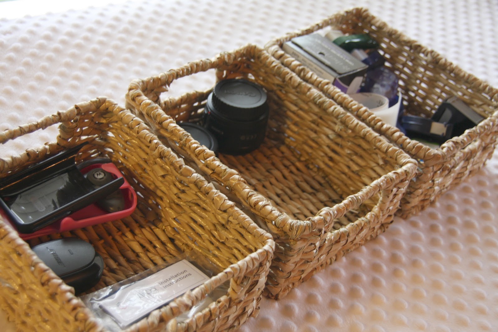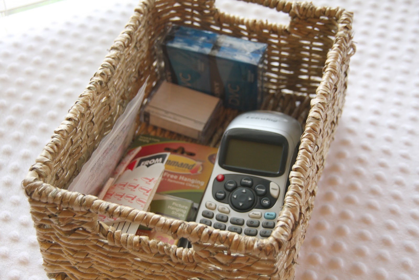 one basket of command adhesive supplies, blank DVD cassette’s, my label maker…