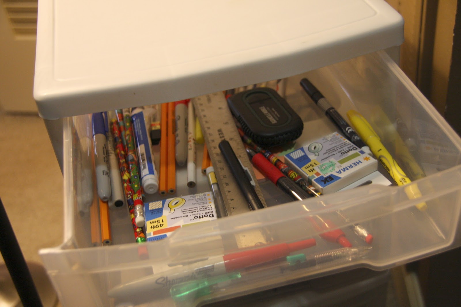 one big basket of office supplies – like printer labels, report covers, and project files….
