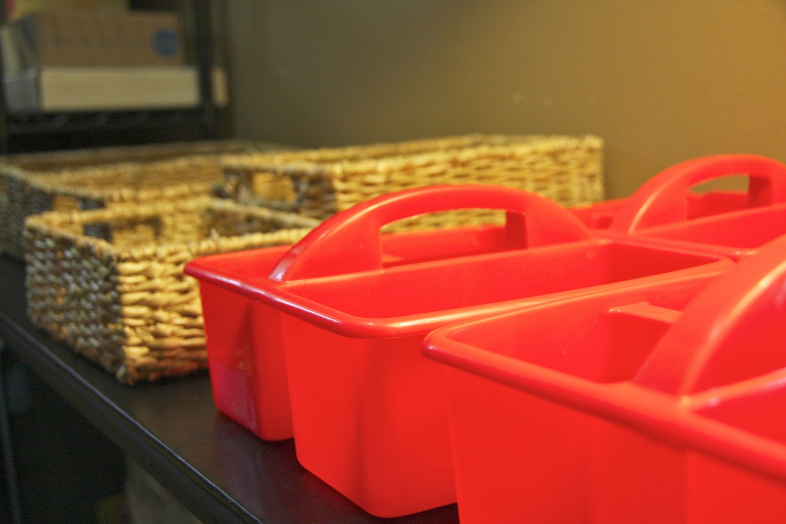 the red caddies store what i would deem as “needs adult supervision” – which is why i placed them on the top shelf…
