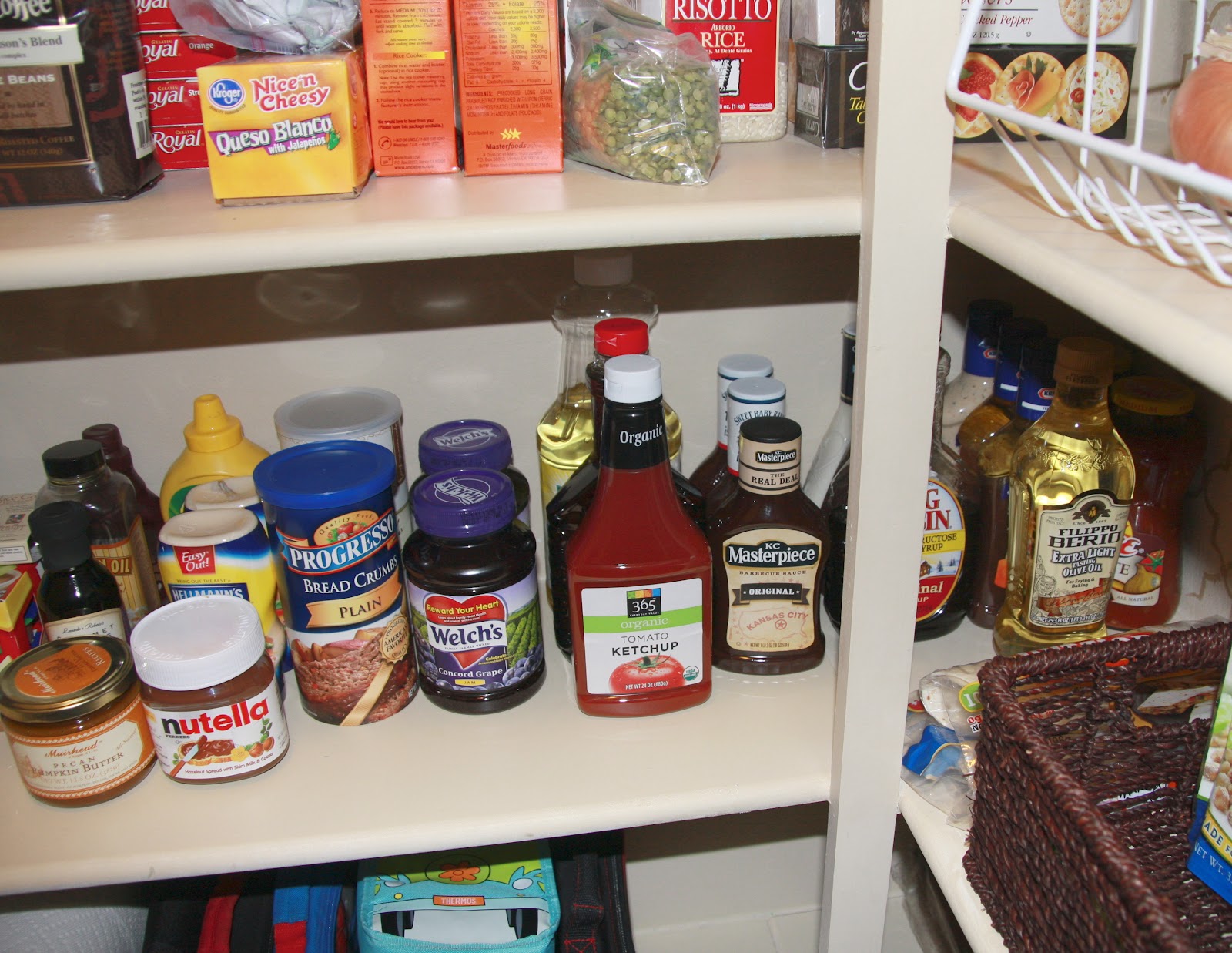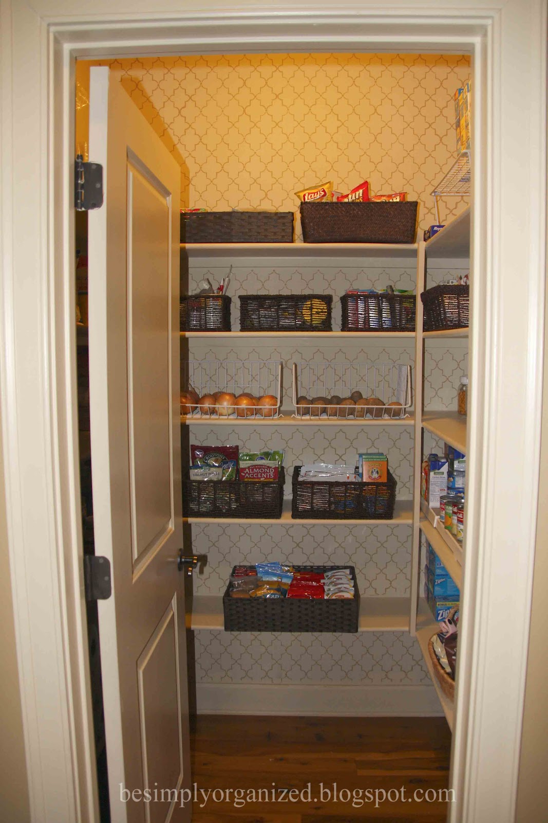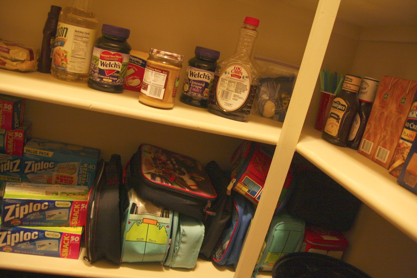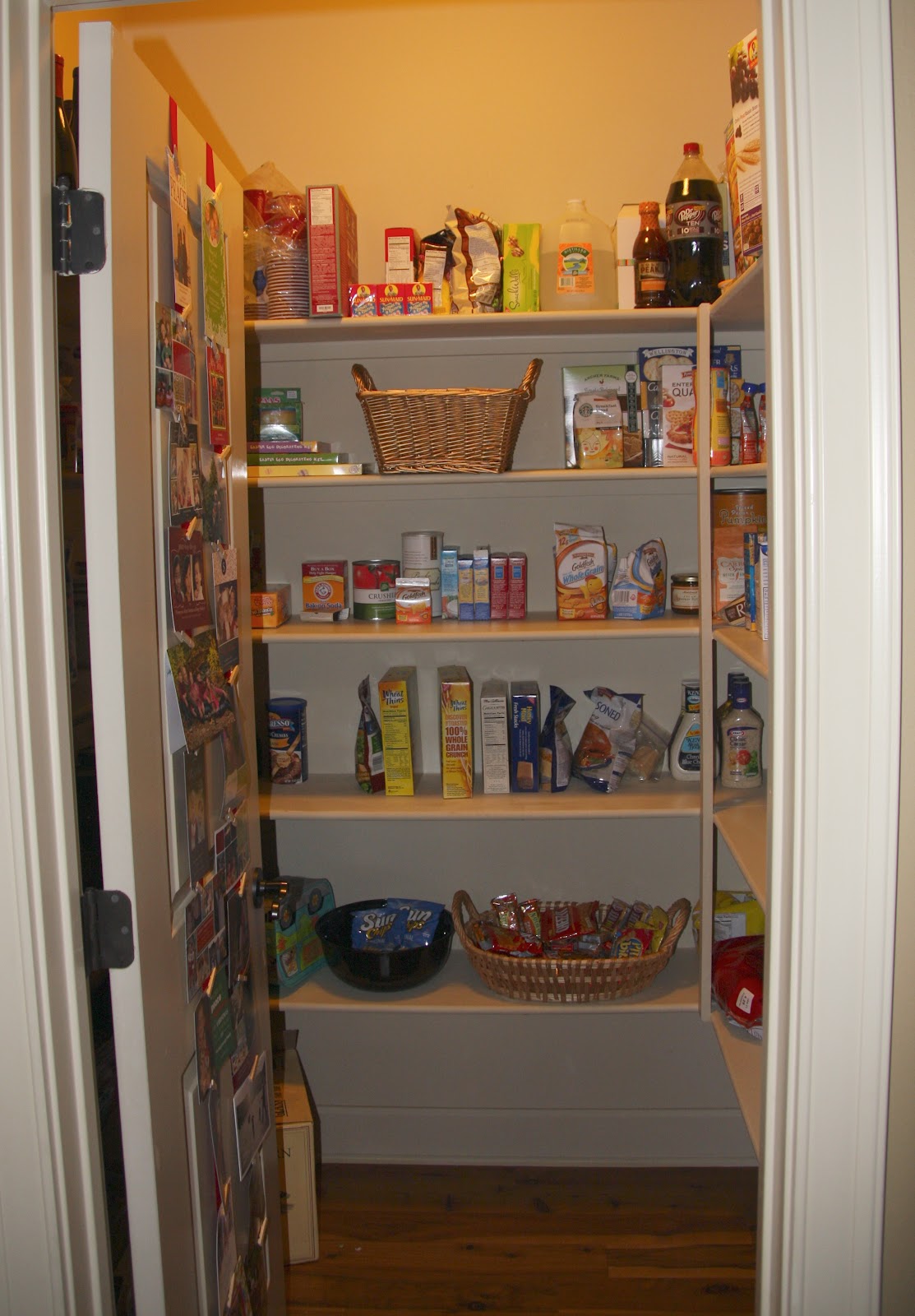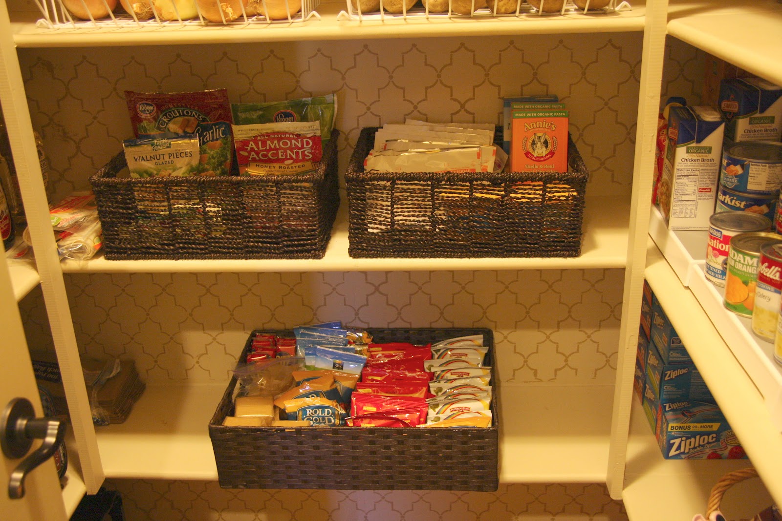 Great job! I like how you put the pretty baskets in the space you see right when you open the door and stored more cans and boxes on the sides. Storing the snacks and lunch items separately in baskets is great! Looks wonderful!