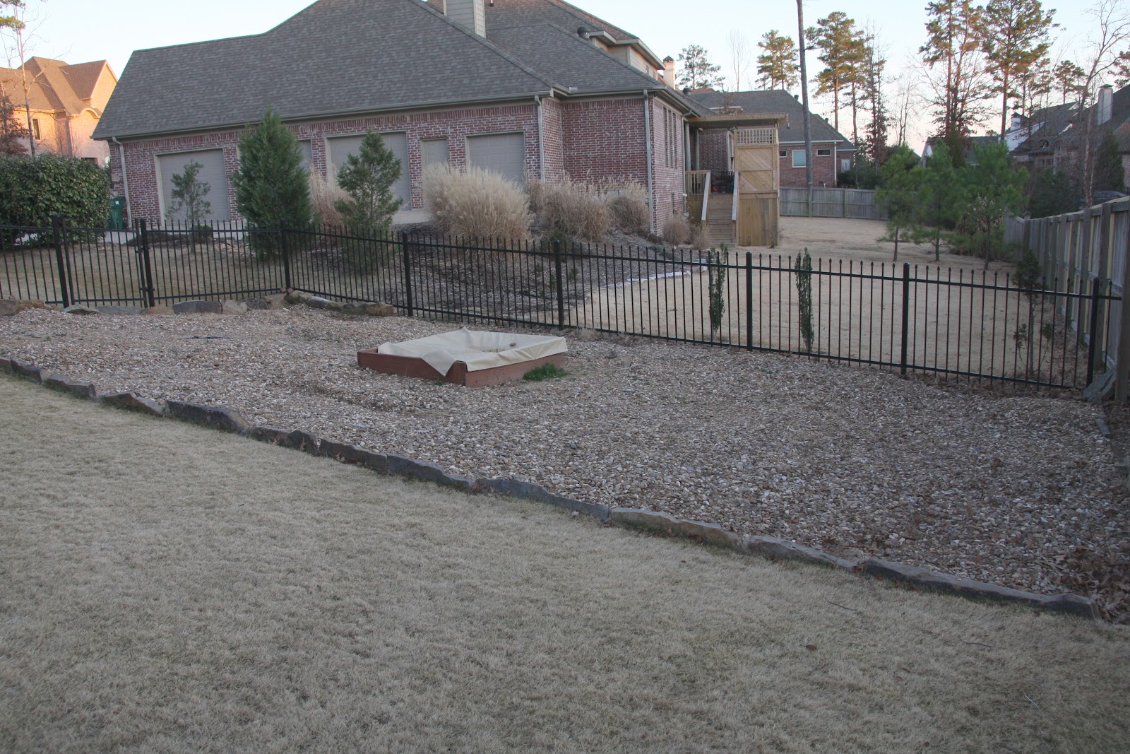 ** half of the play area will stay covered in dirt (the trampoline will sit on top of dirt) and the other half will be grass. phase 2 of this project will be when the grass comes into play. we can’t lay sod now given the cold temps.