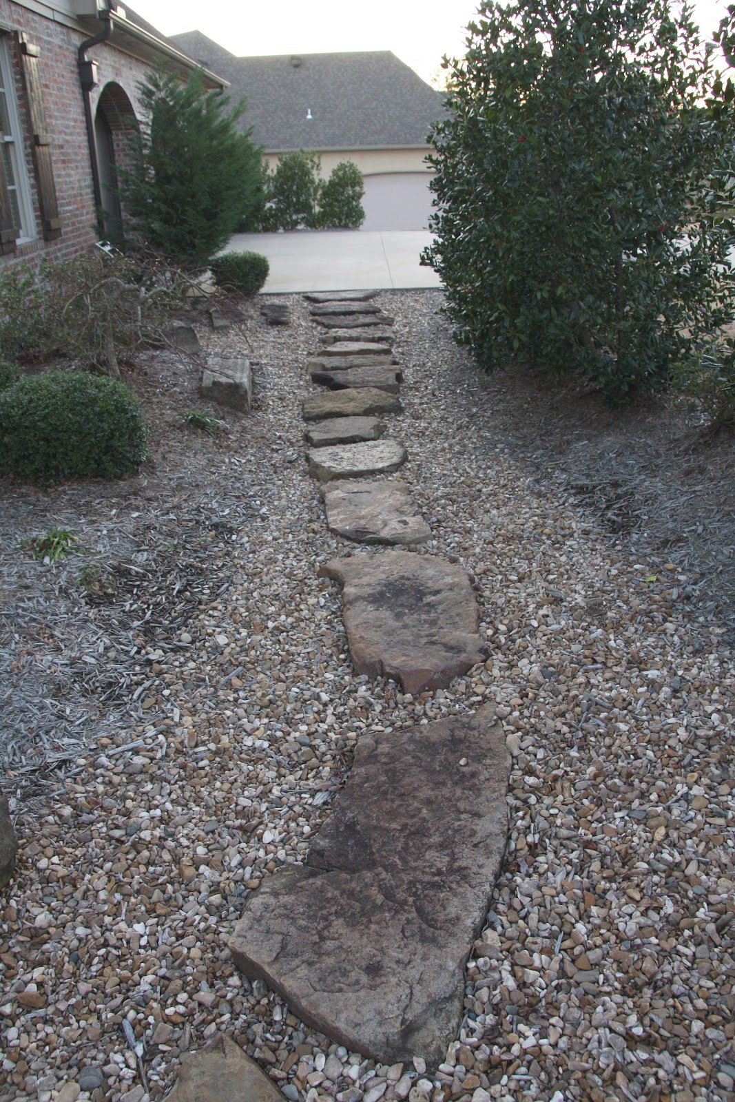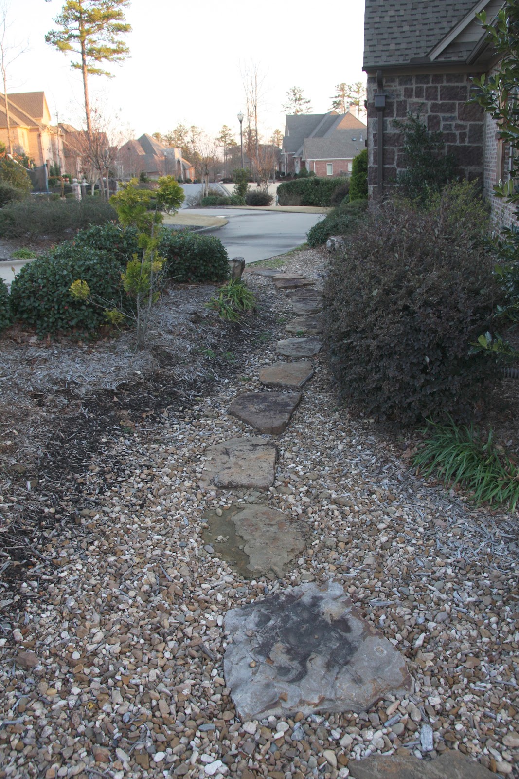 this path wraps around from the front door/driveway to our back driveway where the garage doors are located. you will notice that the rocks and mulch over time have blended together. what this area is in desperate need of is a border. that way rocks stay with rocks, mulch stays with mulch…