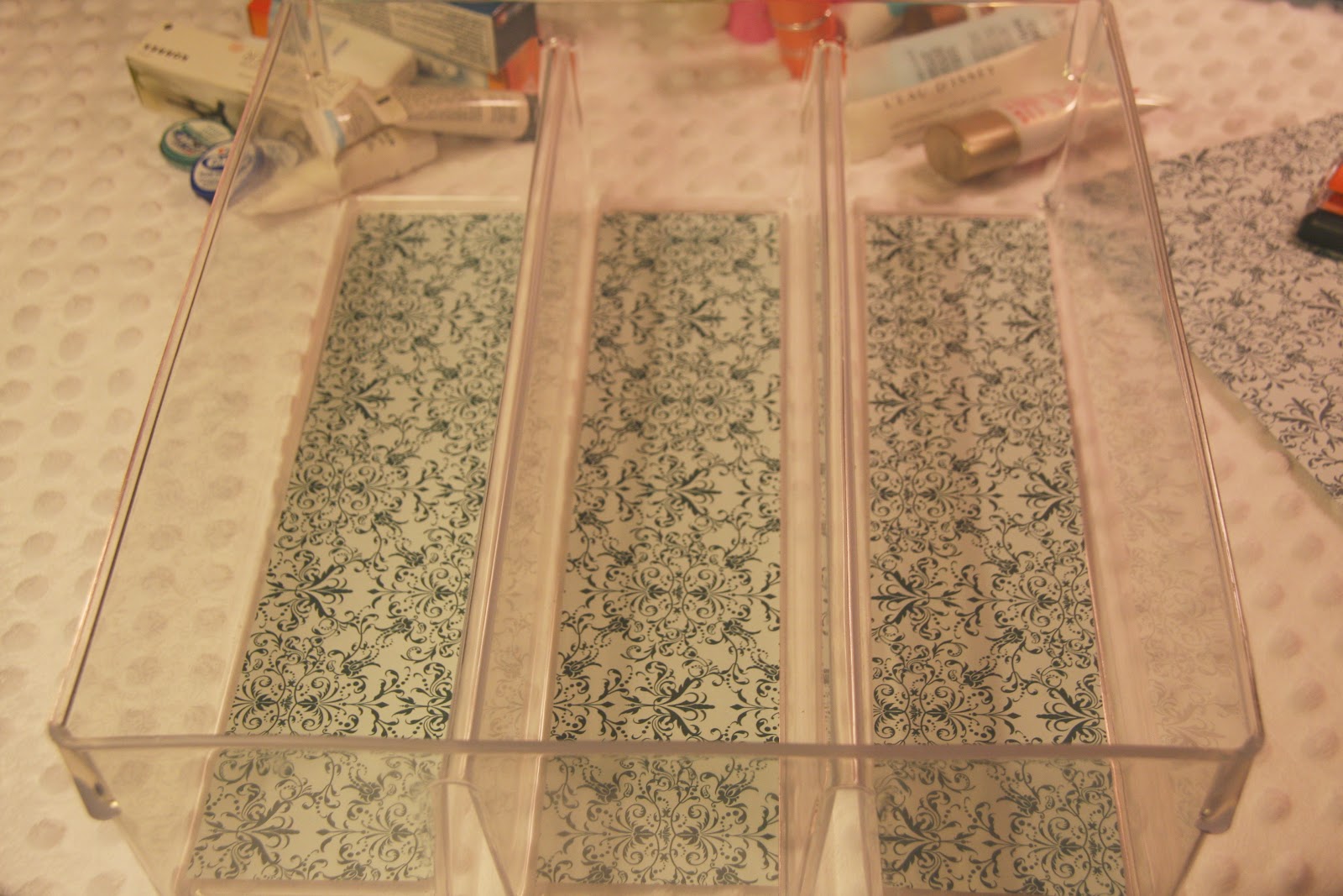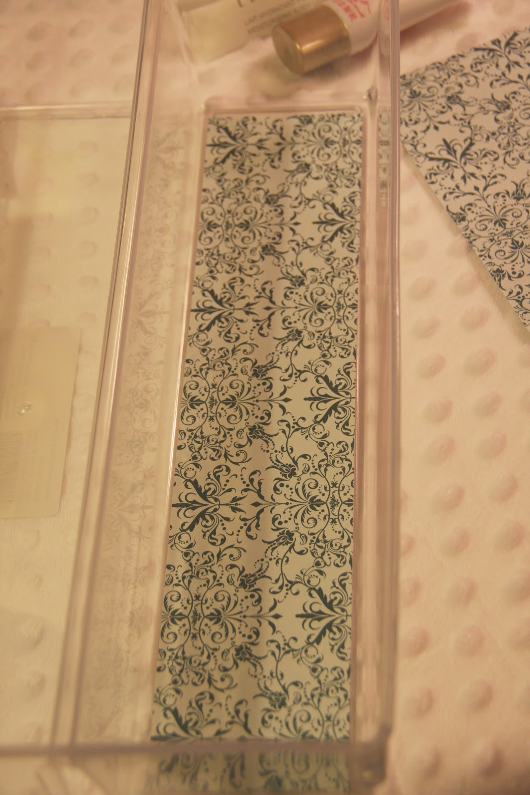 the paper added just a little extra touch, but didn’t cost me a fortune – i had the paper and adhesive on hand and the organizers from target were inexpensive.