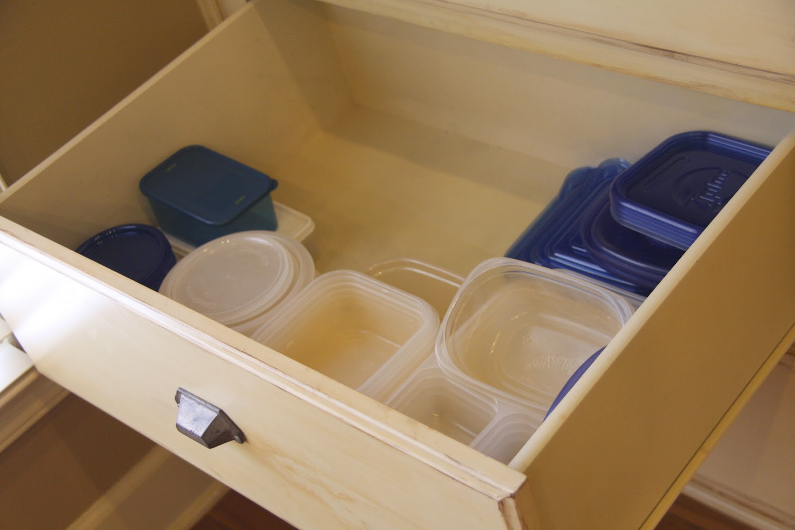 ** while the kids were eating lunch i sorted through our tupperware drawer. i removed old pieces and items without a matching lid/bottom, and then re-organized…