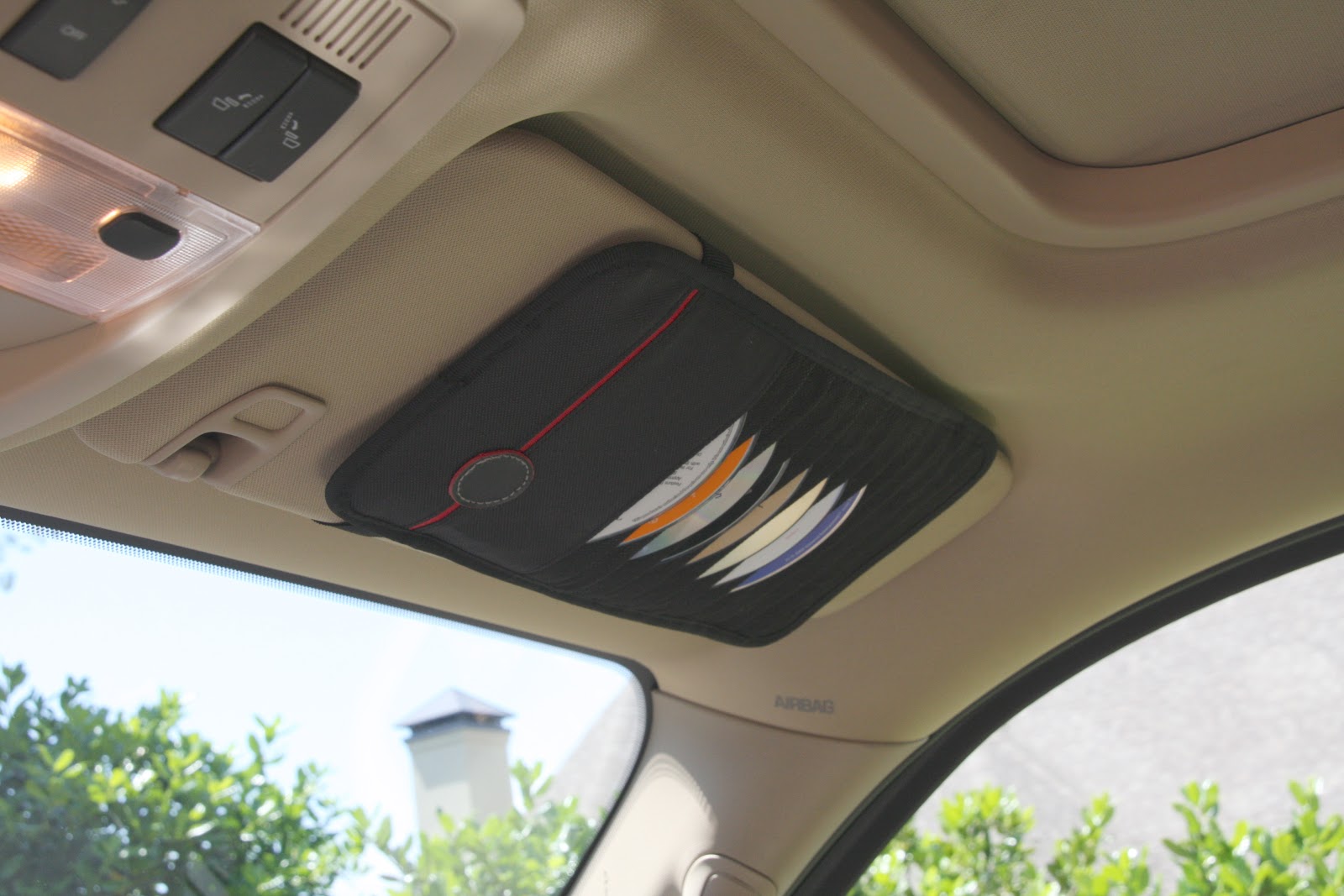 **small but important tip – i have this organizer on the passenger side visor. it had been located on the driver visor until one day when i had my visor pulled down…the sun hit the discs just right and caused a terrible bright reflection for drivers facing me. talk about major hazard! when i noticed the reflection was causing other drivers an issue, i immediately moved it.