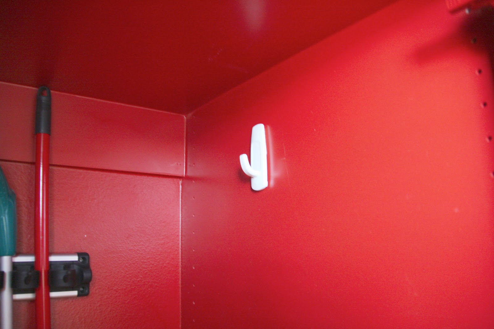 to keep even more of the floor space open, i added a small command adhesive hook for hanging our mop bucket…
