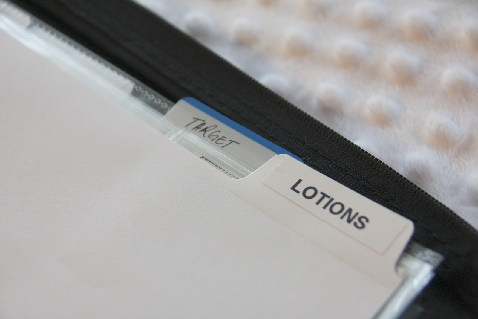 for example, after my “lotions” category in my coupon binder, i added a sheet of target “lotion” coupons…and just labeled it “target”…