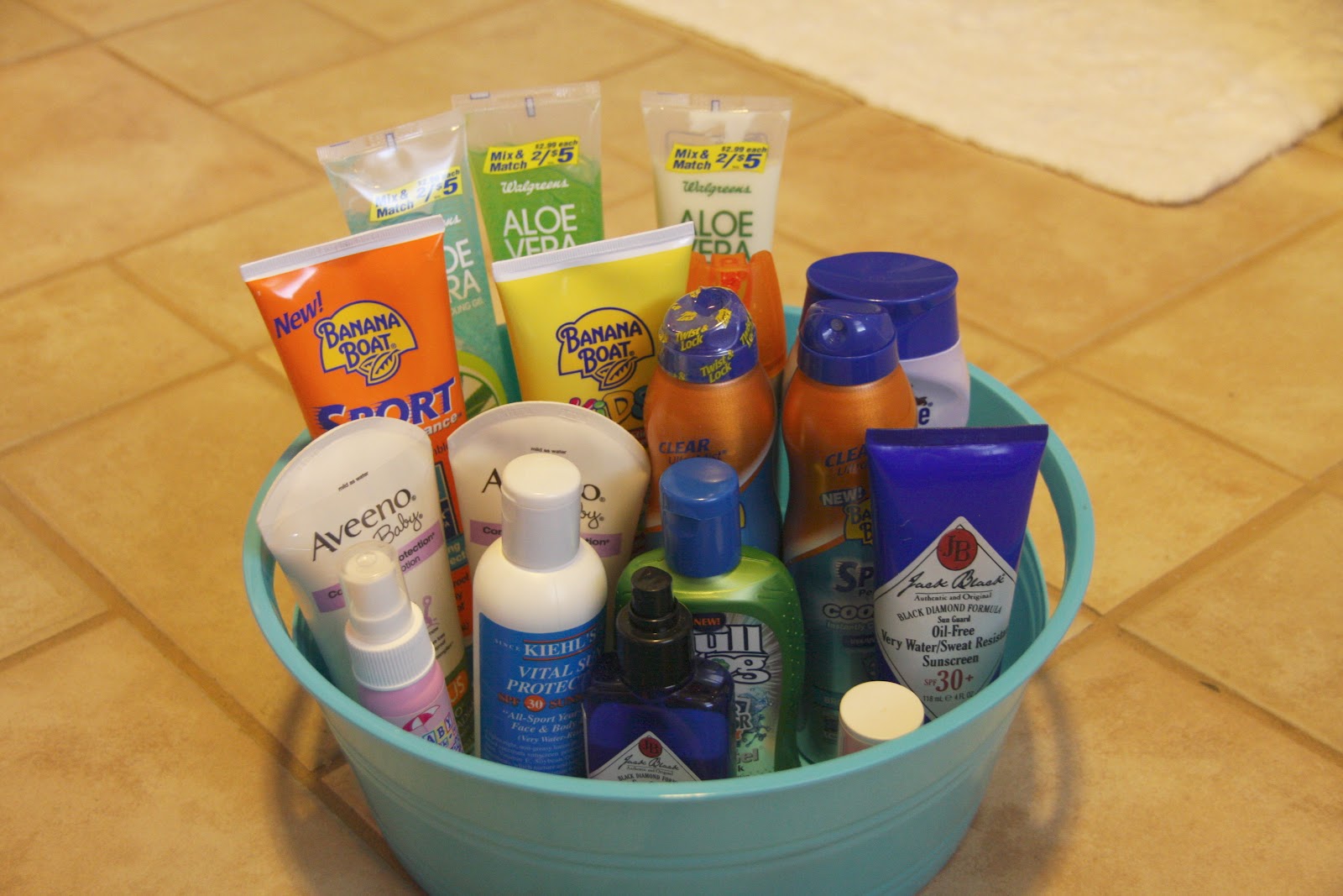back to the sunblock collection…here it is in this shallow plastic tub i grabbed for $1 at the dollar store…