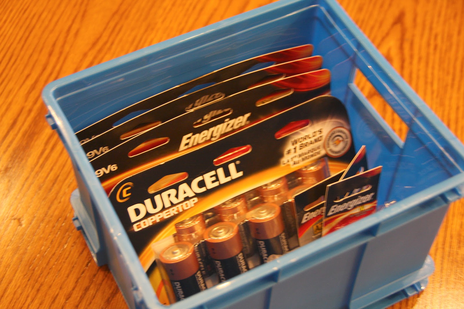 the blue bin next to it contains our unopened packages of batteries…