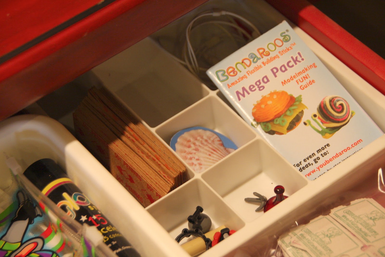 inside i had a small tray organizer that held our 7 year old’s silly band supply, some paper clips (he likes to create things out of paper clips), and some random missing game and toy pieces. i knew the tray would work well in this drawer – and it did. a perfect fit!…