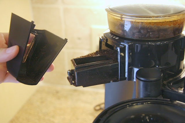 Once the beans are gone, locate the small plastic piece under your grinder that can be removed for cleaning…