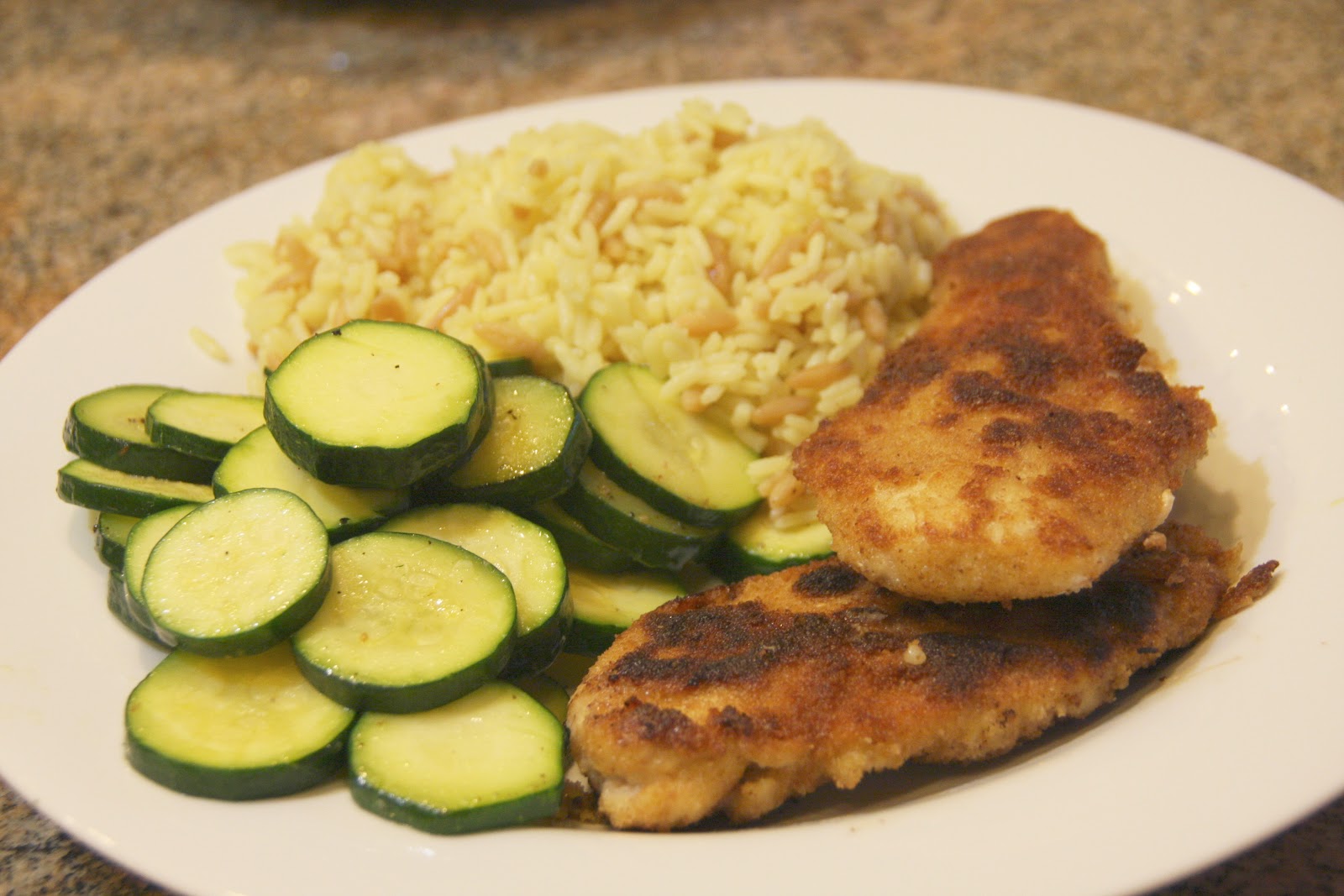 Breaded chicken, sautéed zuchini and rice pilaf…