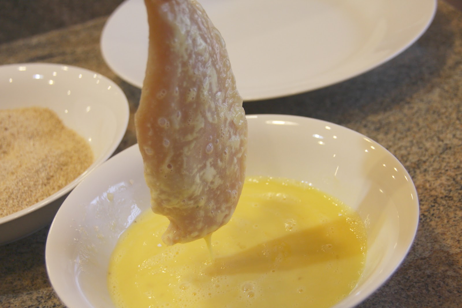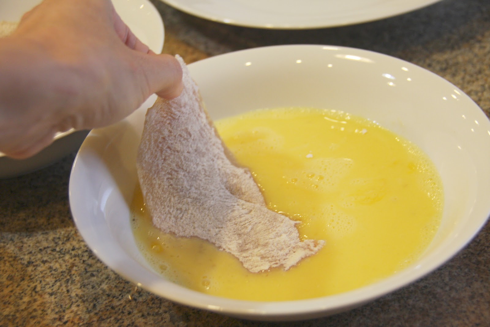 Shake the cutlet lightly to remove any excess flour and coat it with the egg mixture on both sides…