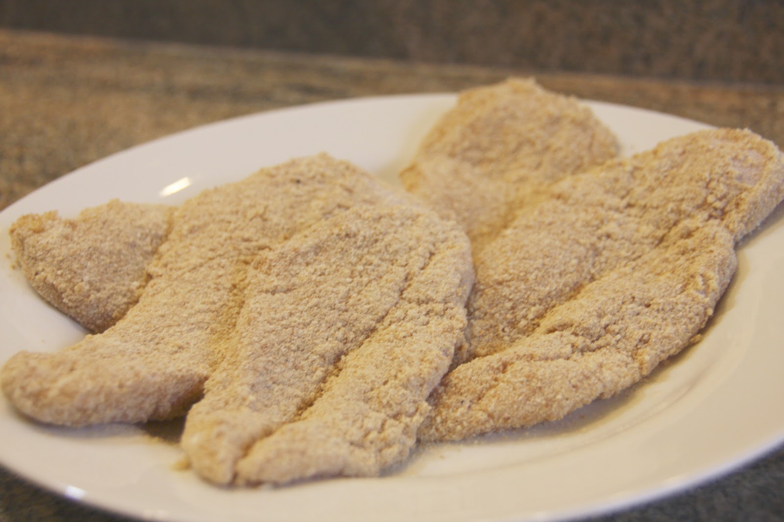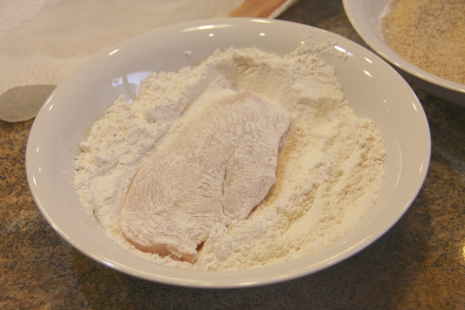 Working with one piece of chicken at a time, start by flouring the cutlet on both sides…
