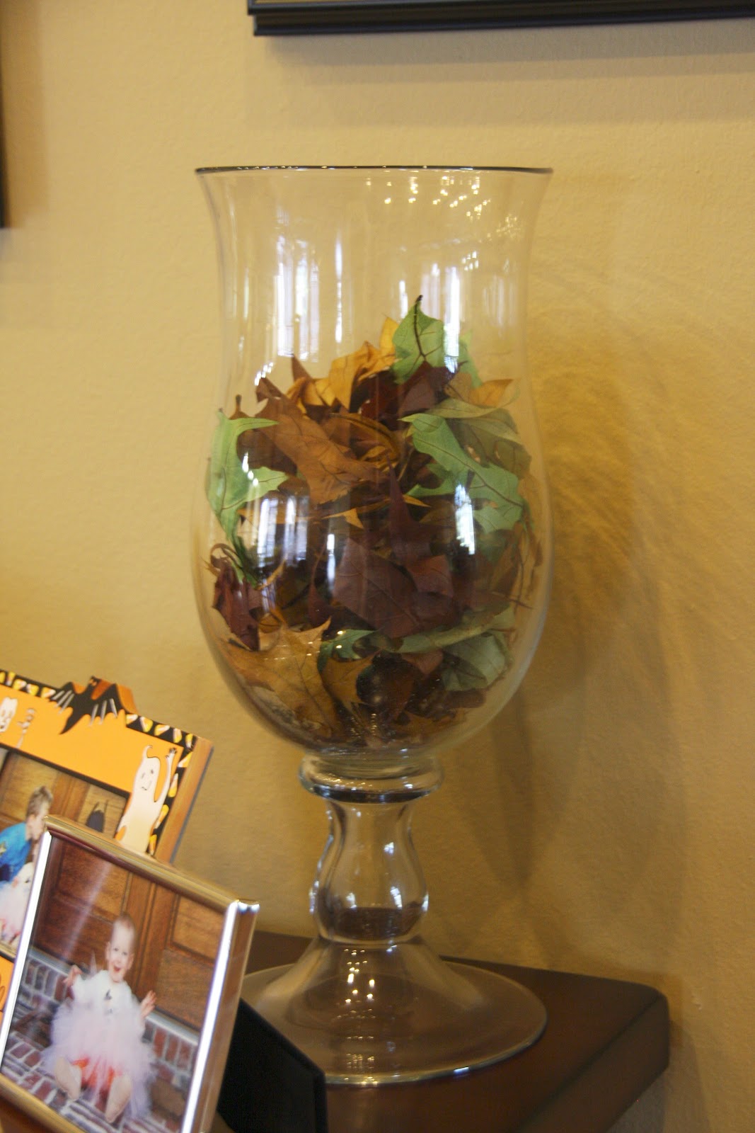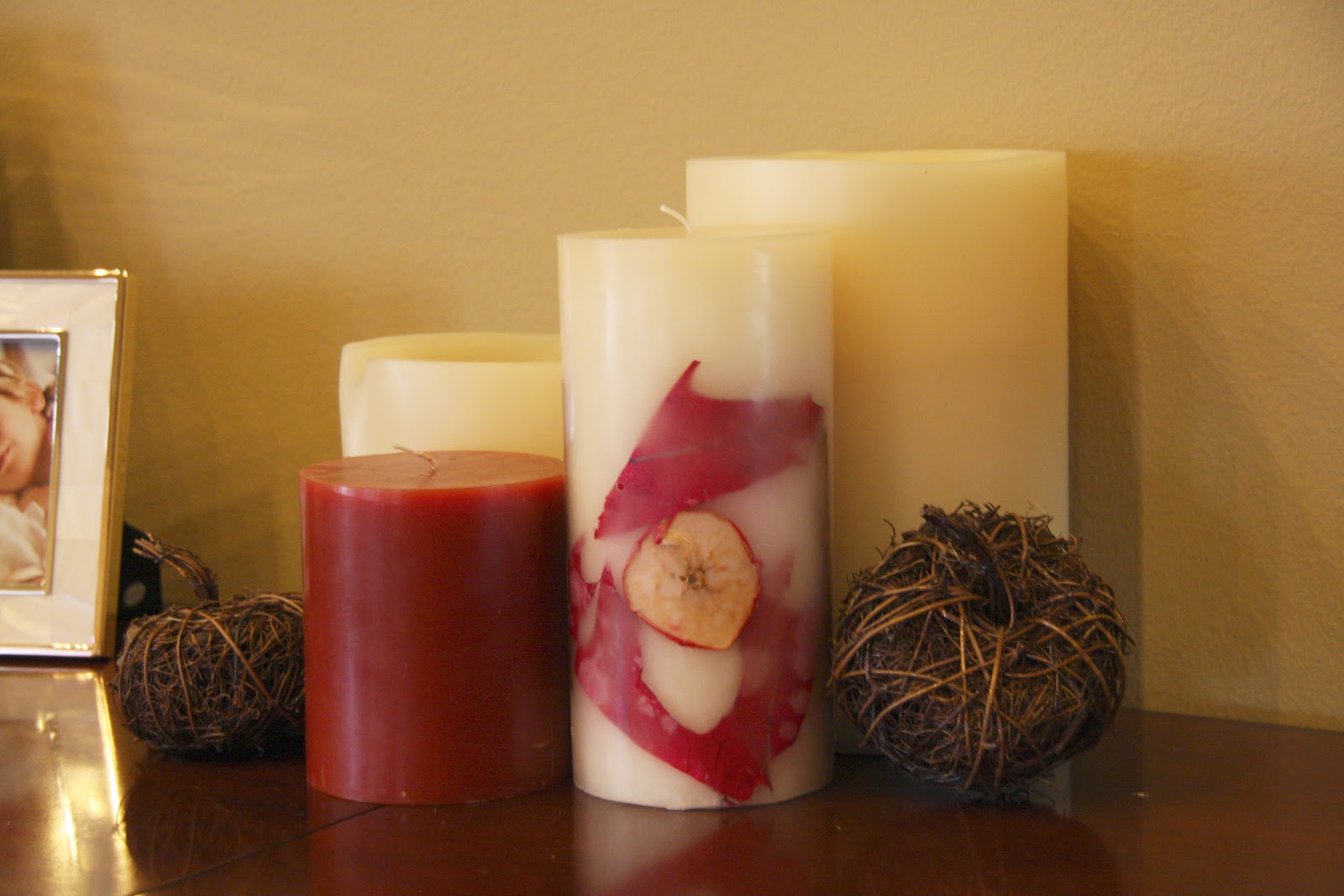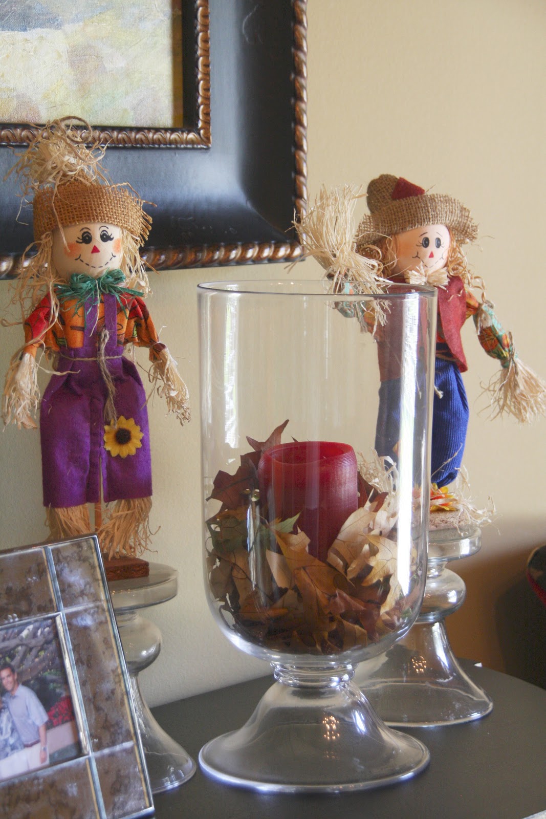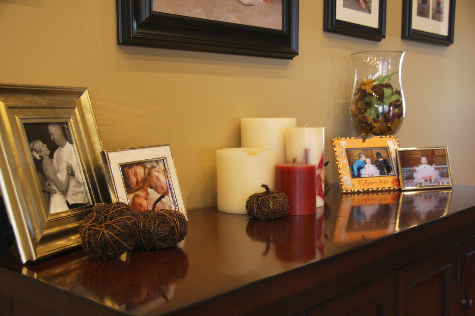 Love fall scented candles…but really love to decorate with photos of the kids from years past. The Halloween photos were taken in 2010…
