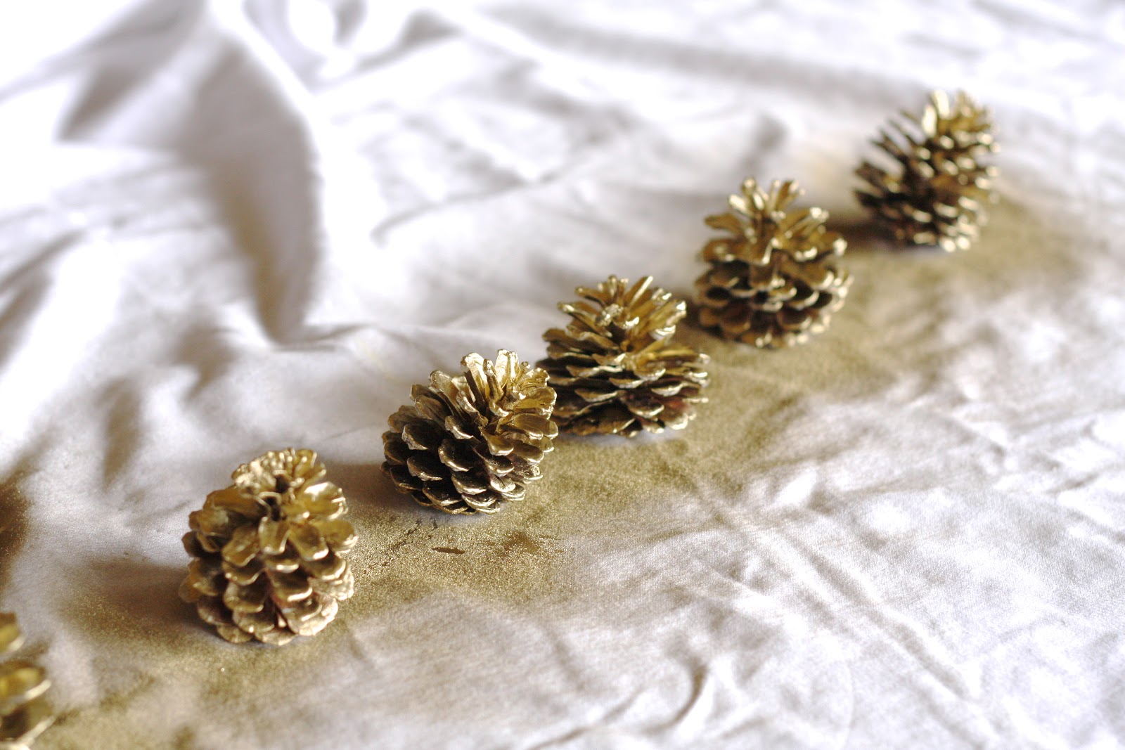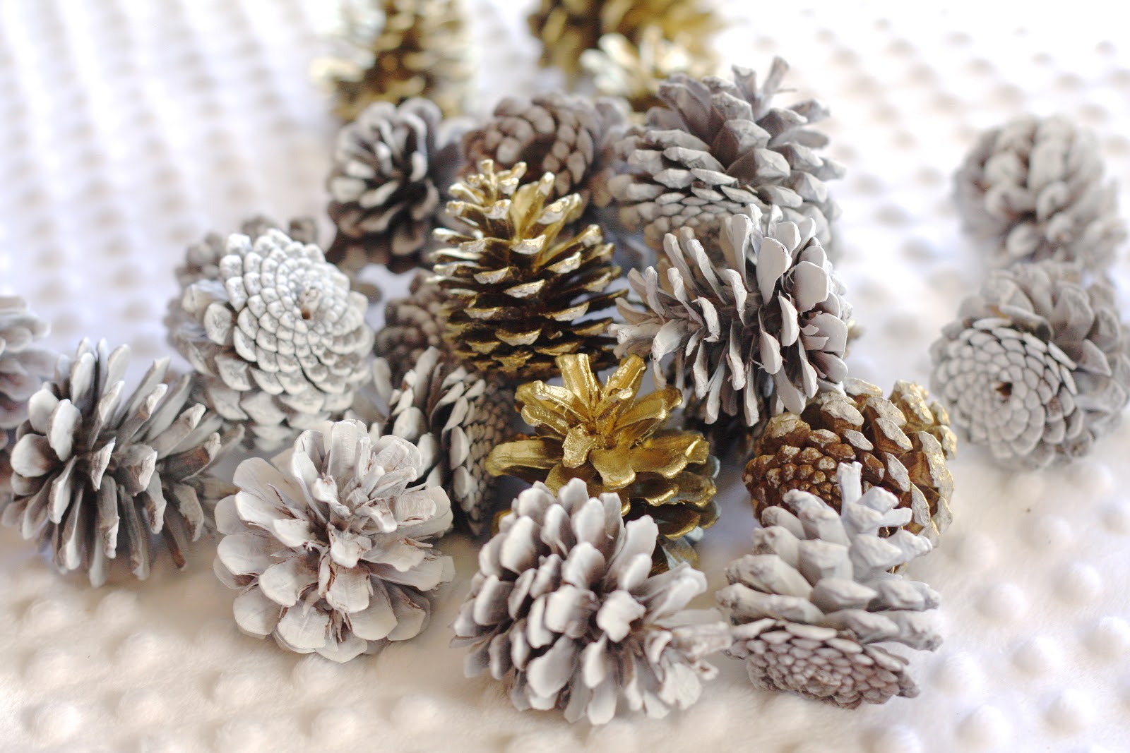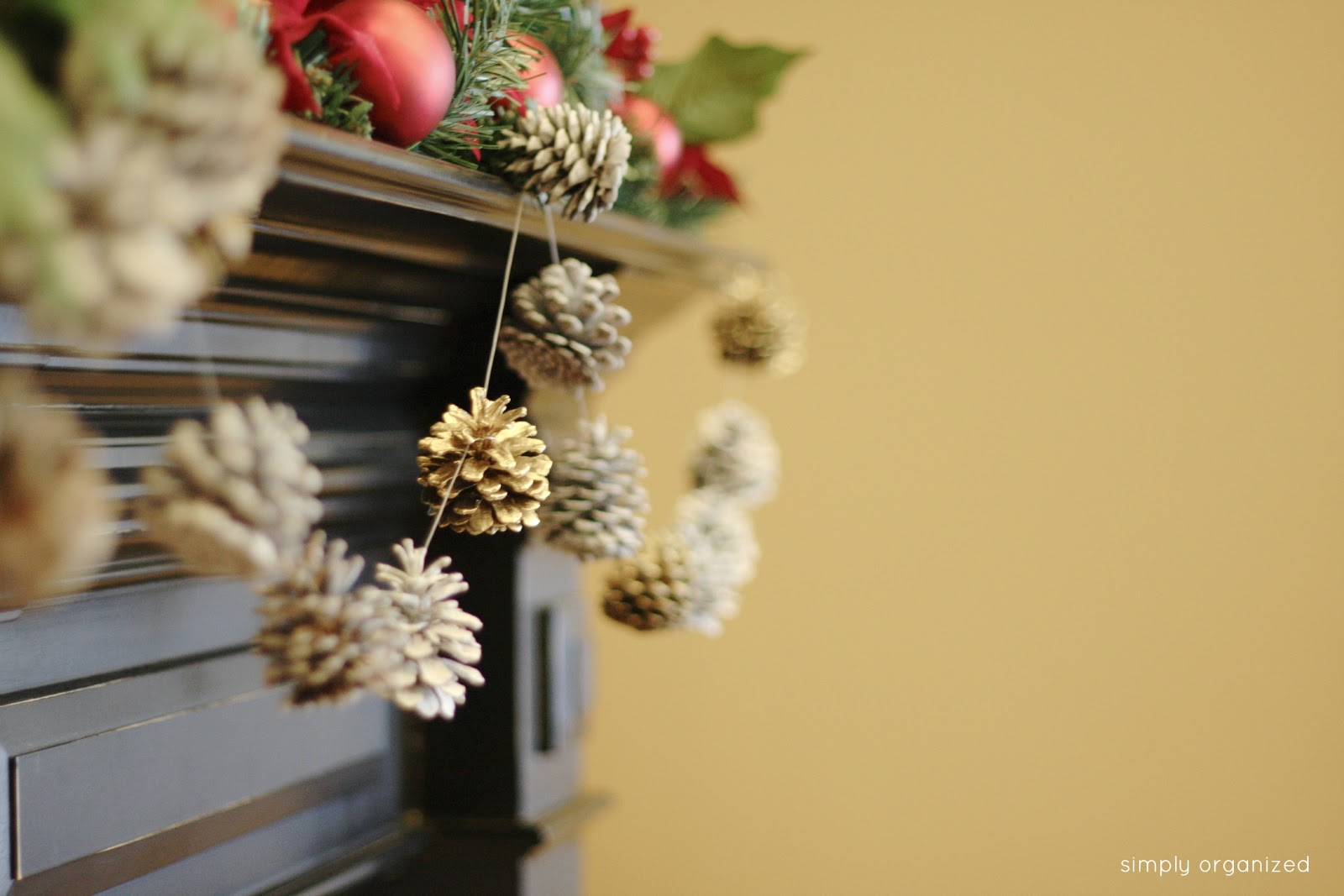 Love the spray painted pine cones and how you made the garland out of them! Great idea! It looks so festive and pretty!