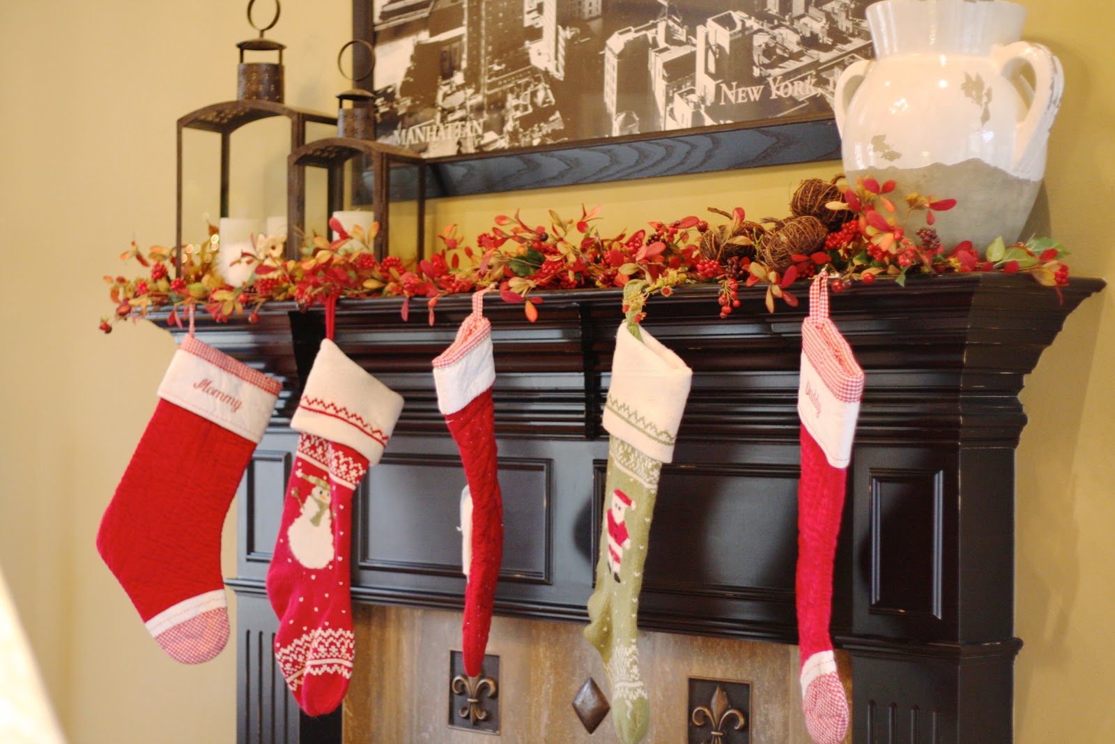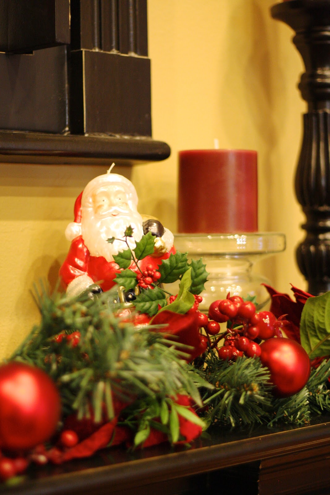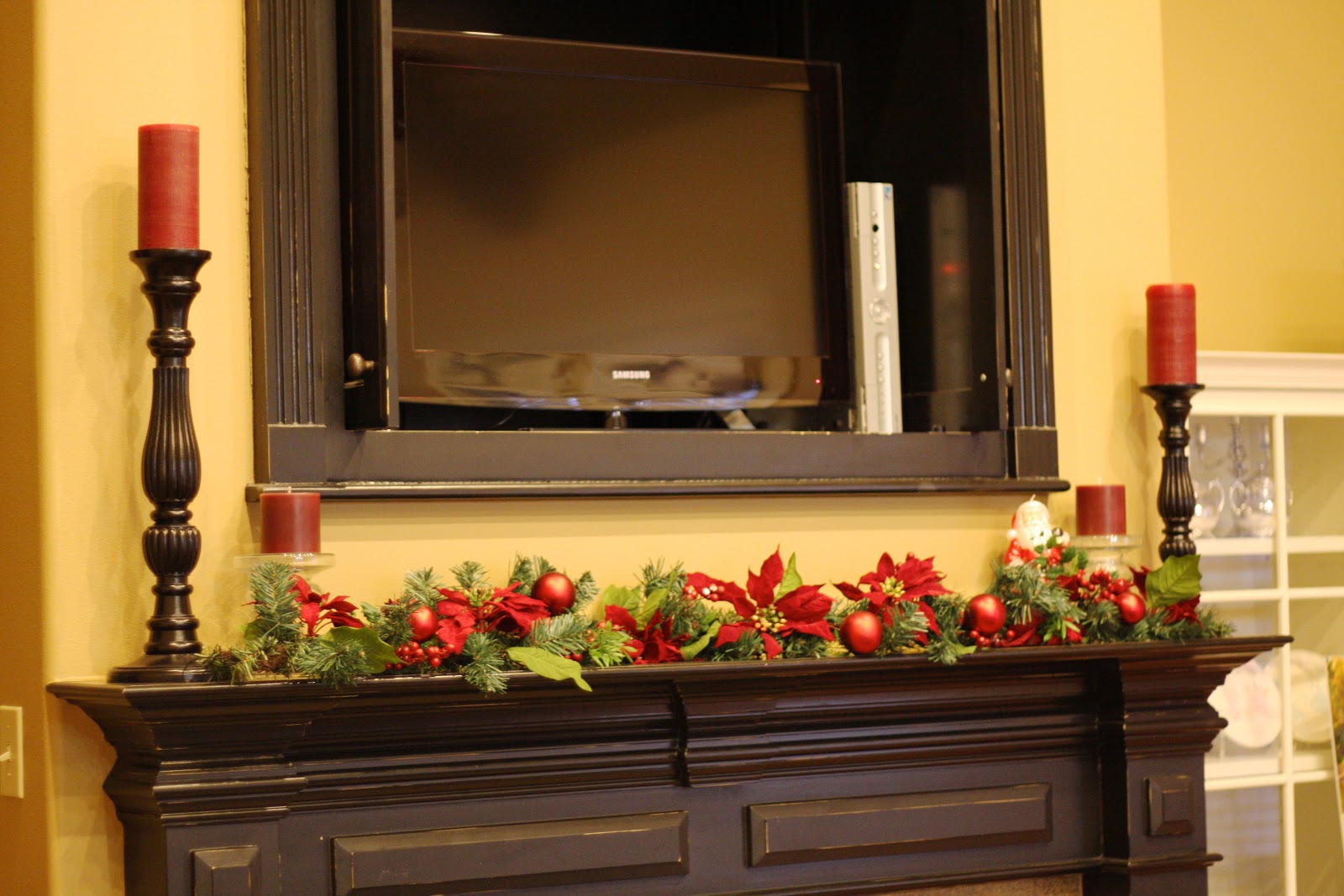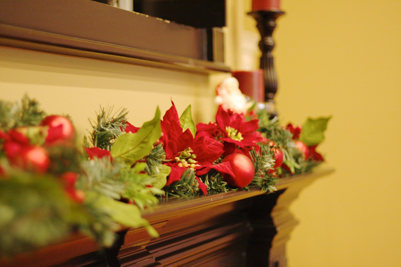 My kitchen mantle…garland with poinsettias and red ball ornaments, along with some candles…