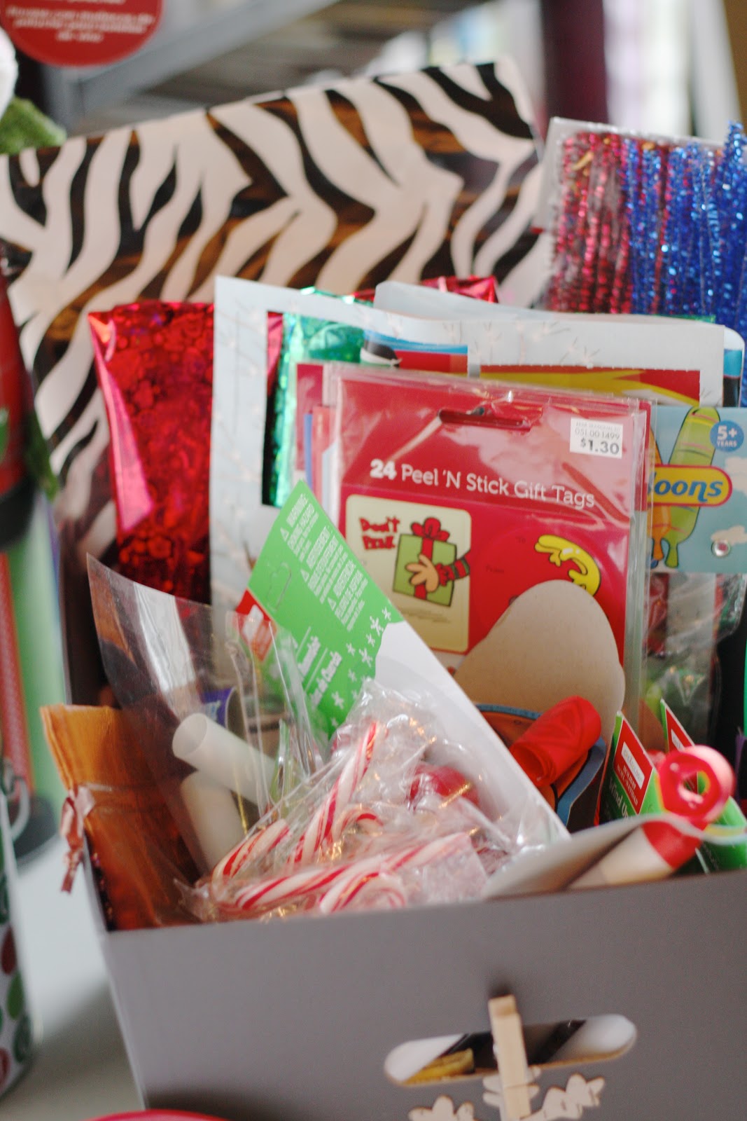 The grey bin holds smaller items used for adding to the outside of a package, like mini candy canes, sparkly twist ties, sticker gift tags, and more…