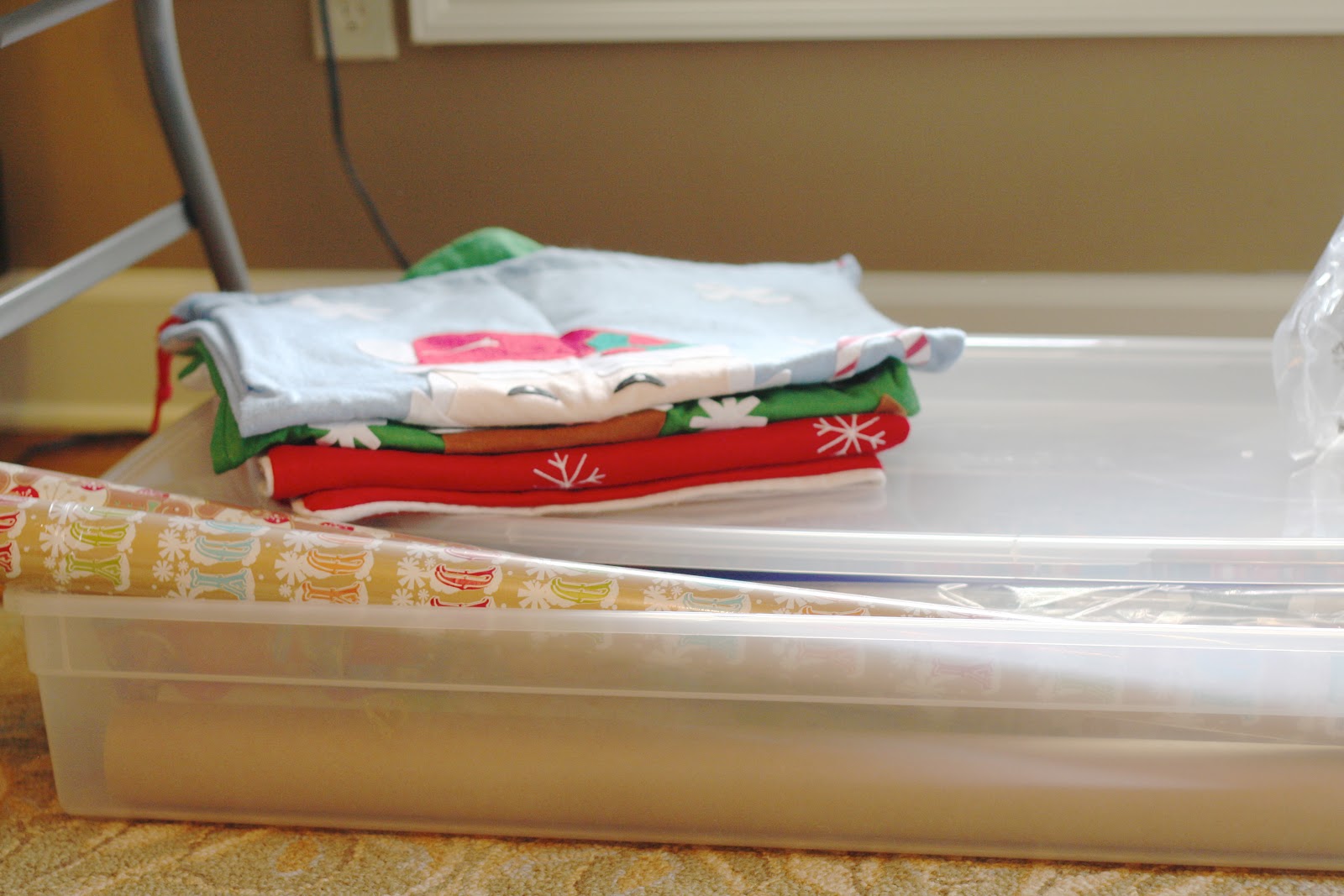 During the rest of the year, wrapping paper stays neat and tidy in this bin that gets tucked away with the rest of the holiday decor…