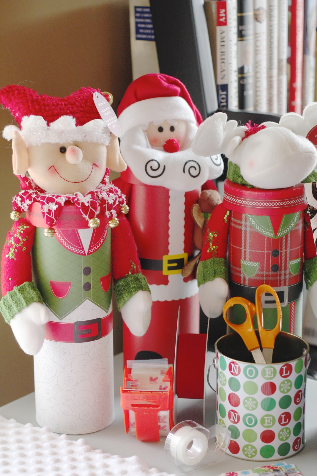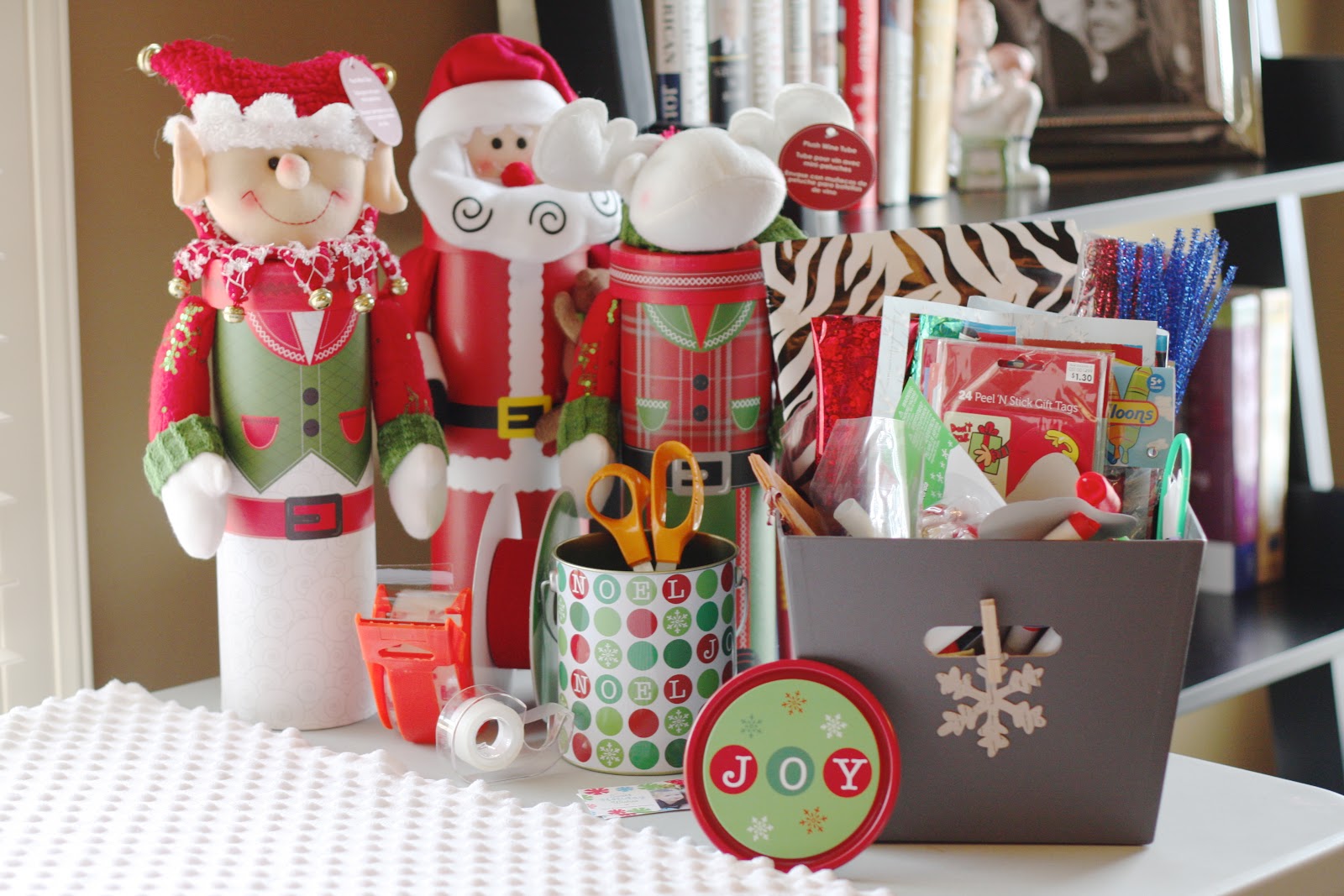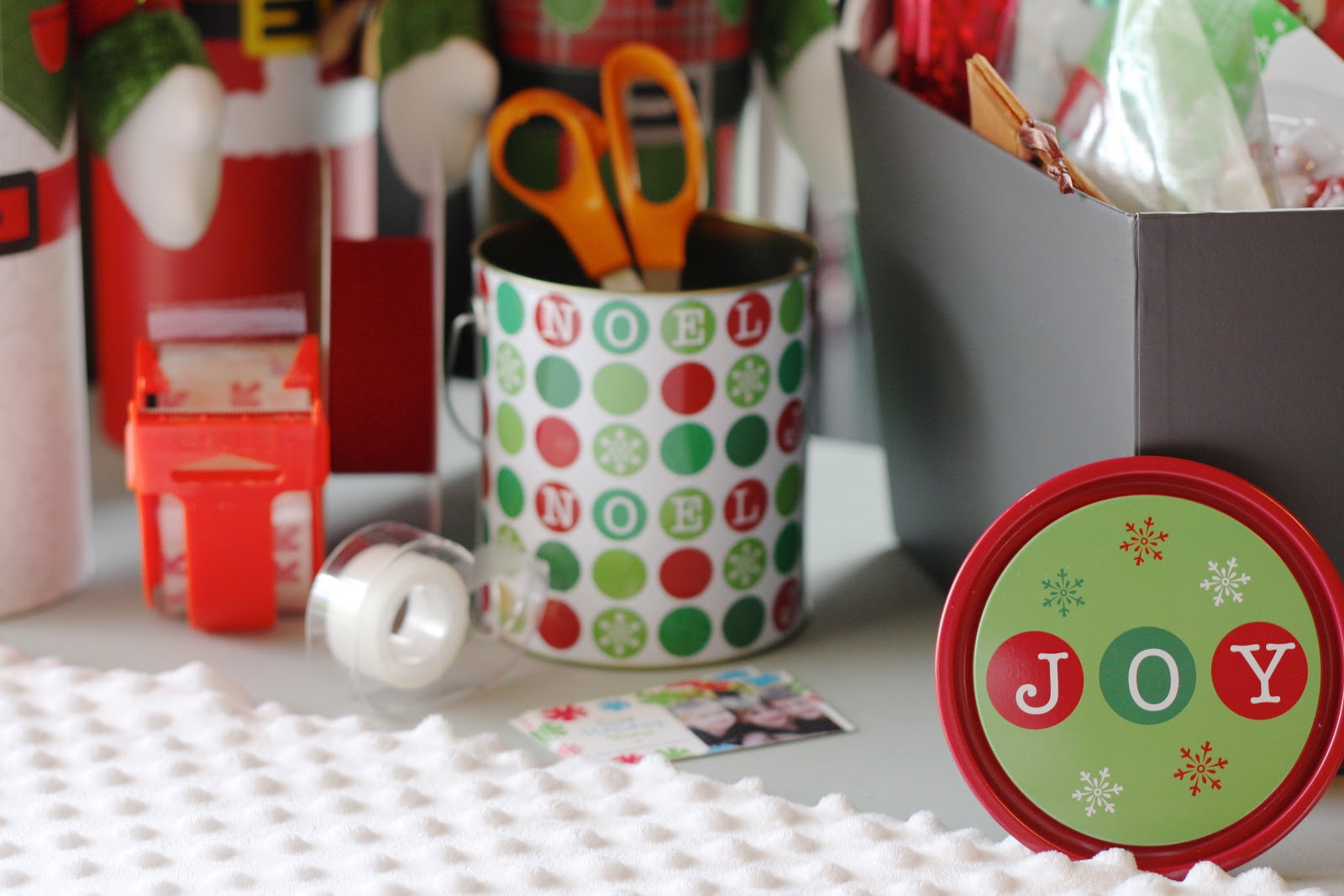 You can also re-use items to keep your station super organized…like this noel tin. It was part of a gift received a few years ago that is now being used to contain pens and scissors. When I’m done with a wrapping session, I just grab the tin and remove it from the table so the kids can’t get into it…