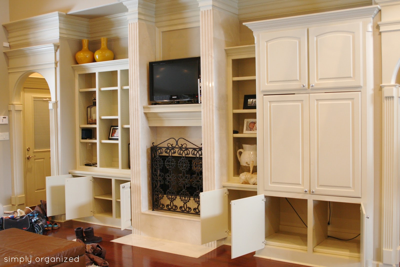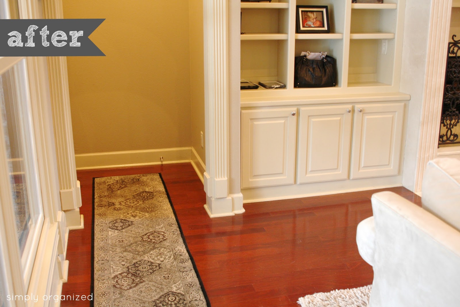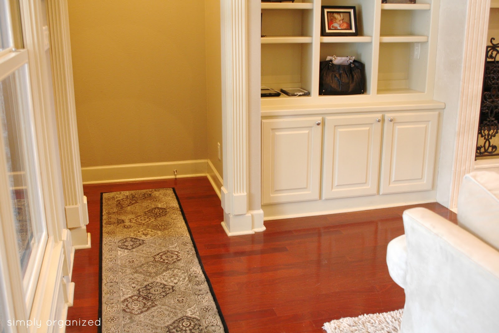 Anyway, while unpacking boxes one afternoon, I noticed the empty cabinets in the living room built-in. Which is just inside the entry from the garage…