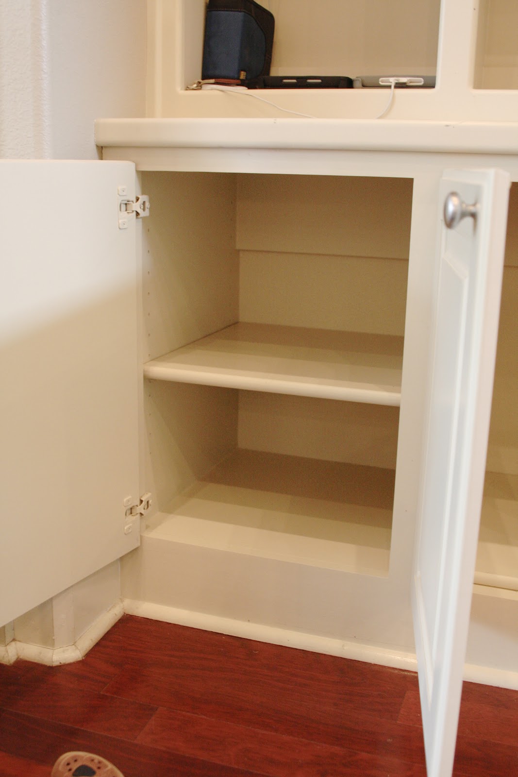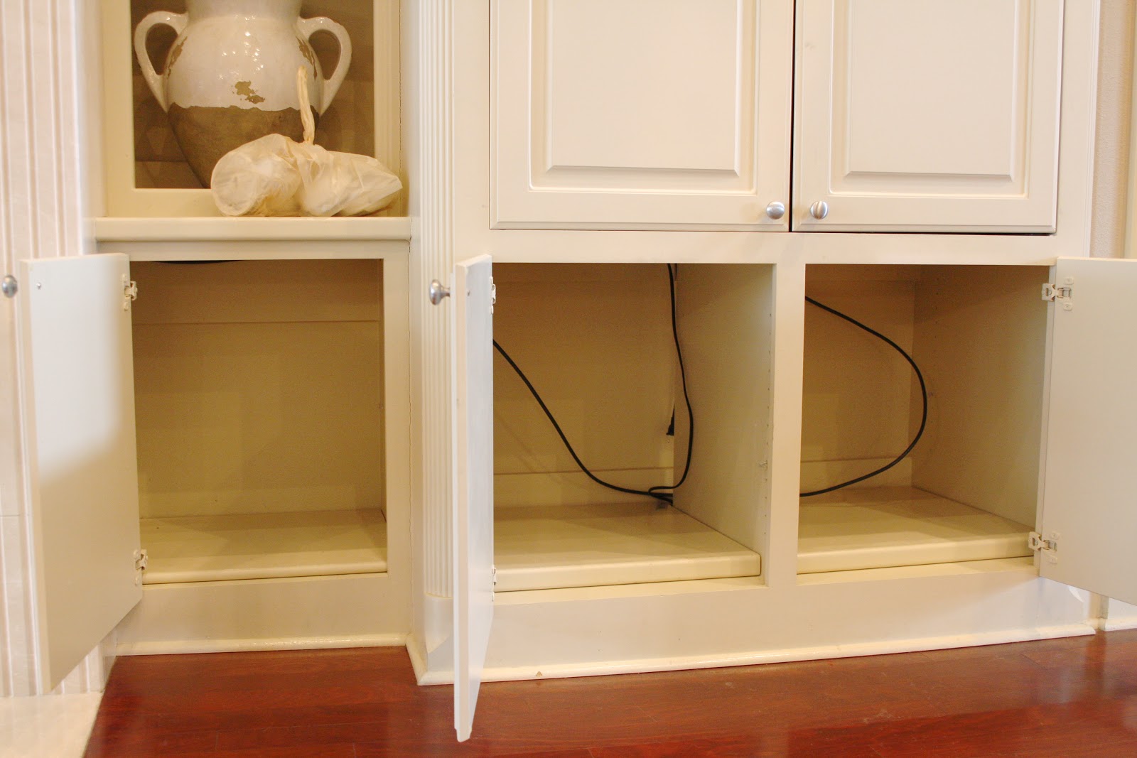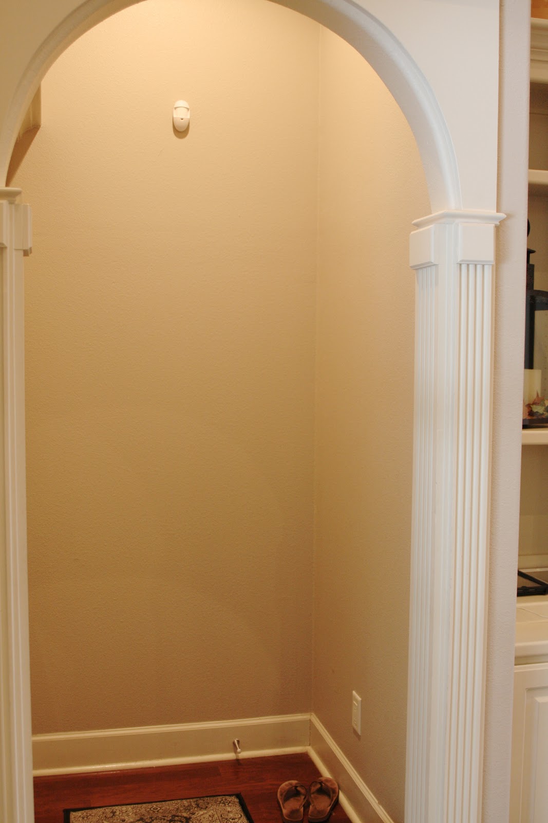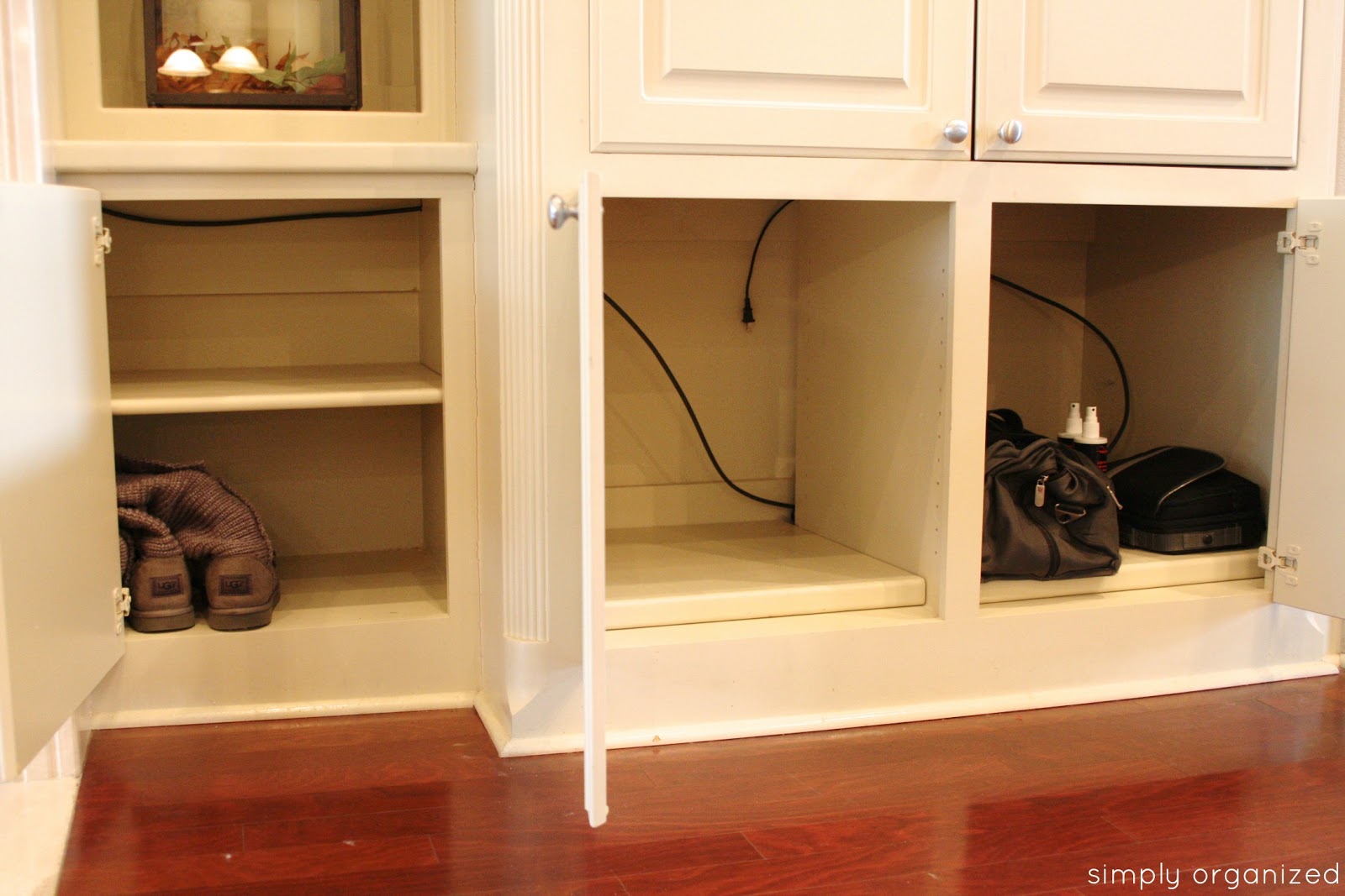Anyway, while unpacking boxes one afternoon, I noticed the empty cabinets in the living room built-in. Which is just inside the entry from the garage…