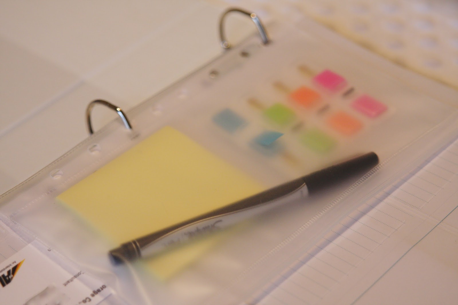 In the pouch I keep post-it flags, post-it notes and my favorite pen. If you’re a pen snob (like me), my favorite pens have a fine tip. I love this sharpie pen…