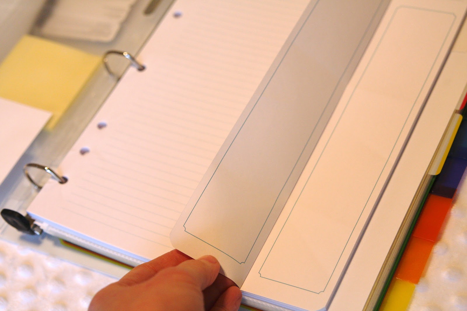 Having the go-to binder is super important for large families where things are more likely to get thrown into the 100th 'Misc' bin. I, personally, chose a very bright fluorescent color so that when I'm looking around across the room I can pick it out like a sore thumb.