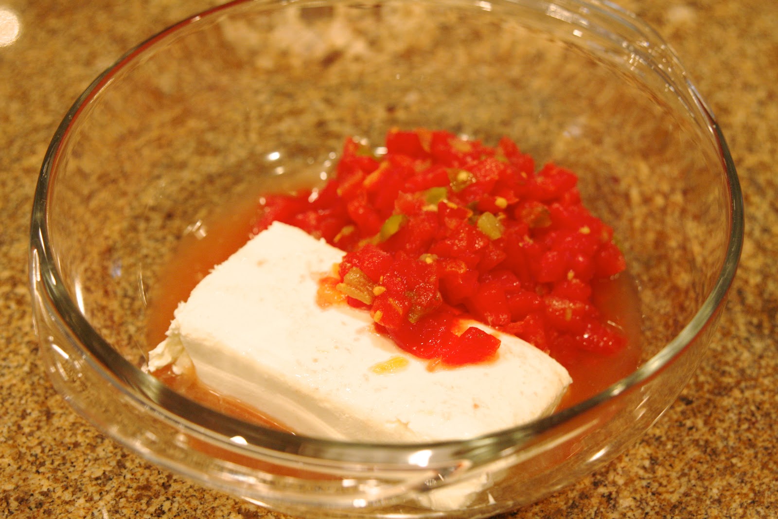 You’ll start by leaving your 8 ounce cream cheese bar on the counter to soften. Once soft, toss it in a bowl and add 1 can of rotel…