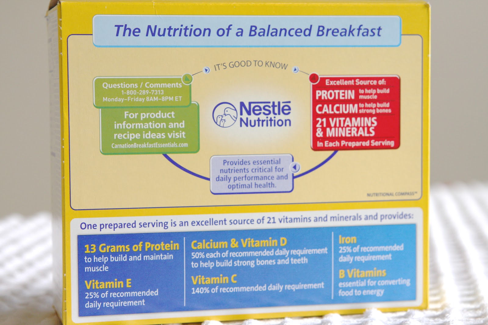 When the nutritionist suggested creating recipes from Carnation instant breakfast, I was questionable. For some reason I thought it was more of a “junk food” type product. Then she handed me a sample that listed all of the vitamins and minerals. I figured it was worth a shot. In case you haven’t seen a box of these packets for a while, here’s some great info straight from the box itself…