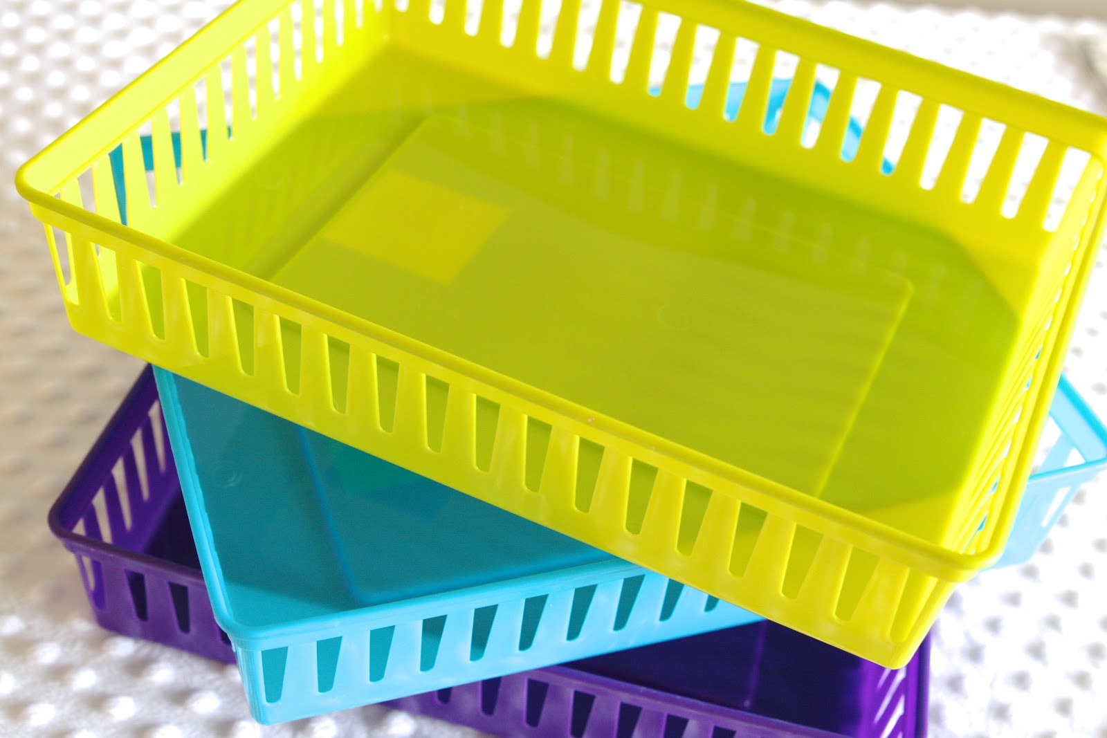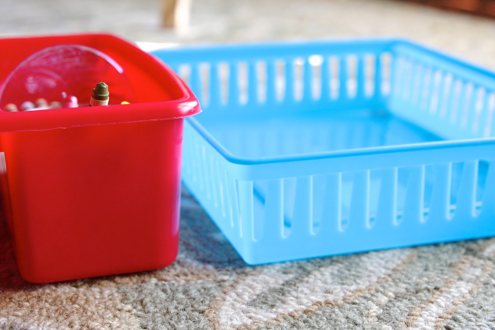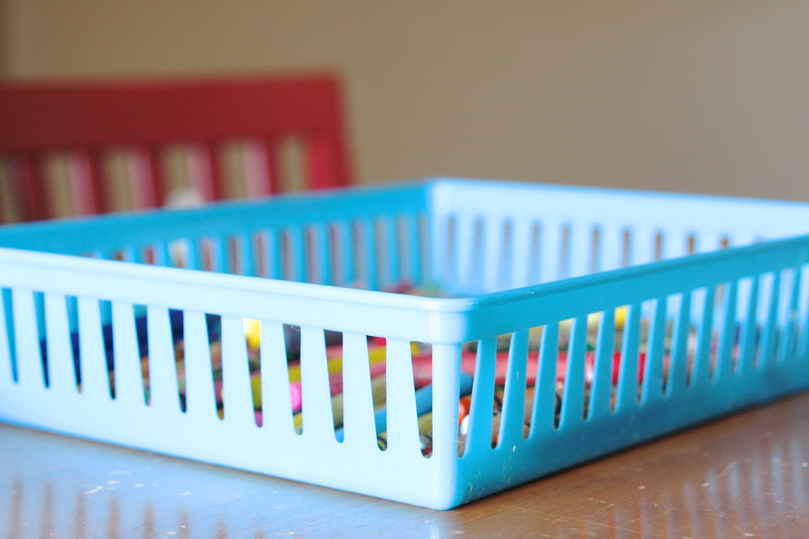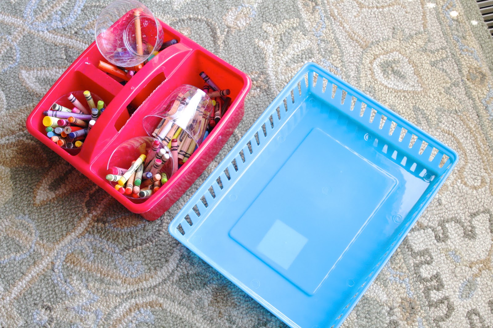 Essentially, I was looking for something shallow enough to hold a typical amount of crayons, a container that made it easy for him to grab what he wanted without digging, and one that wasn’t complicated to toss the crayons back in.