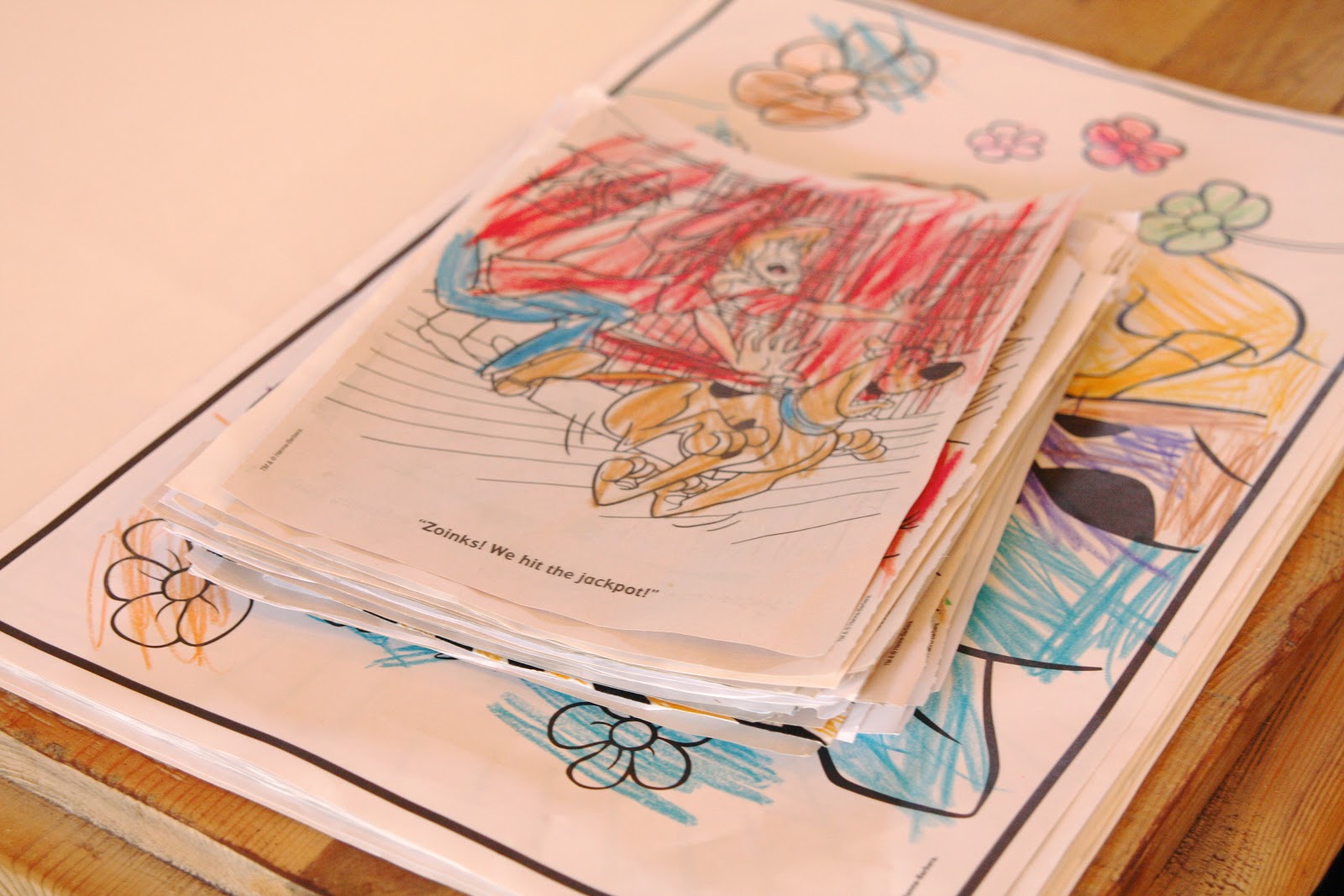 What do we do with all of this art work? Because he doesn’t want his work in the recycling bin, I tuck it away neatly inside an oversized scooby coloring page folder…