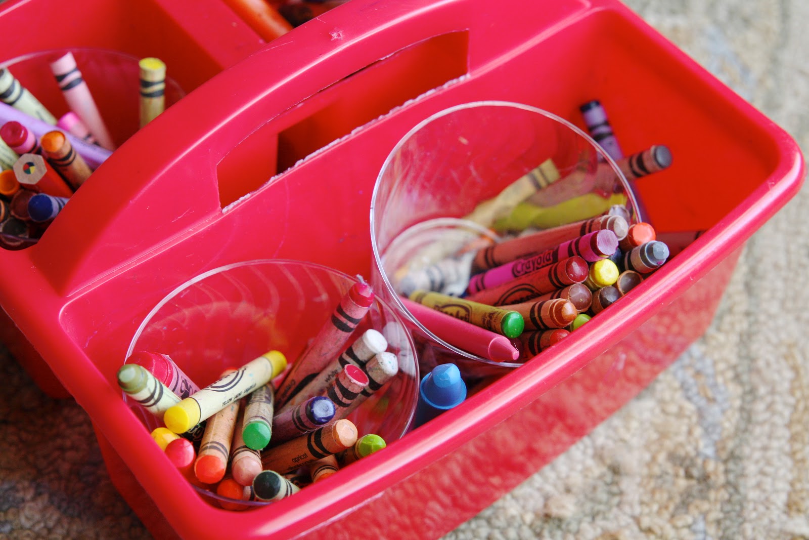 Then I tweaked it when the kids got tired of digging into the compartment holding the smaller crayons. I added plastic cups to help the crayons stand up…