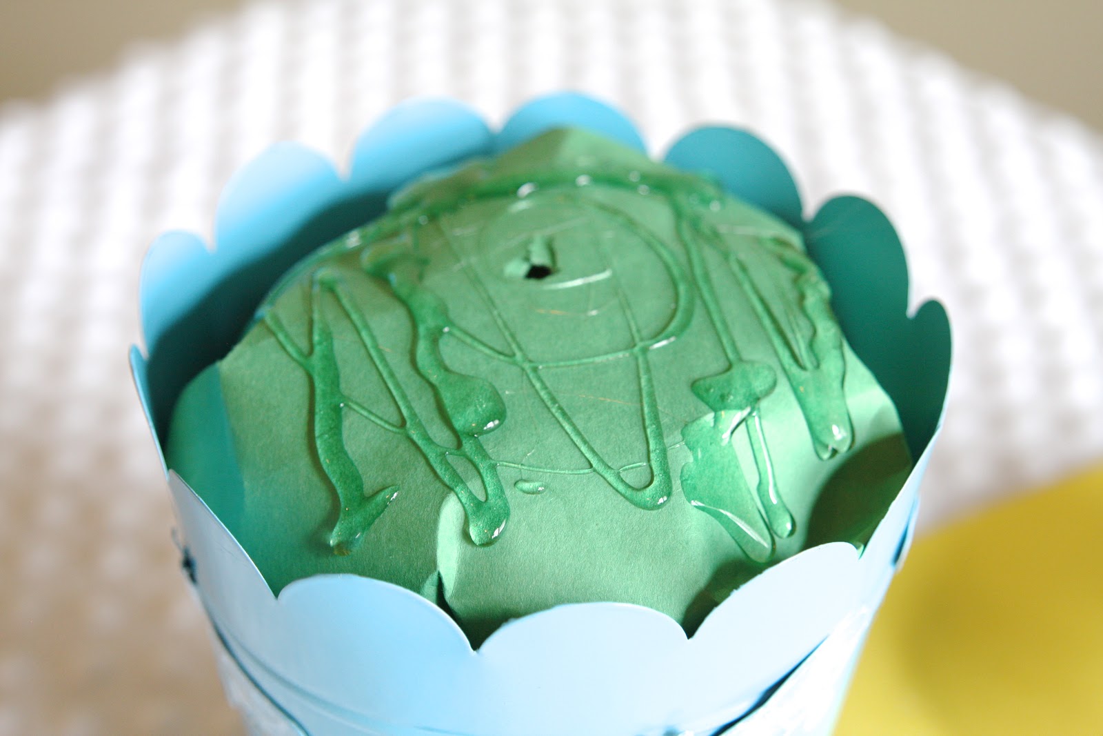 Before I glued down the grass, I poked a hole into the middle as a mold for the big flower pinwheel. I worried that the pinwheel wouldn’t poke through after the grass was on…And the bottom of the pinwheel stick doesn’t have a sharp end…
