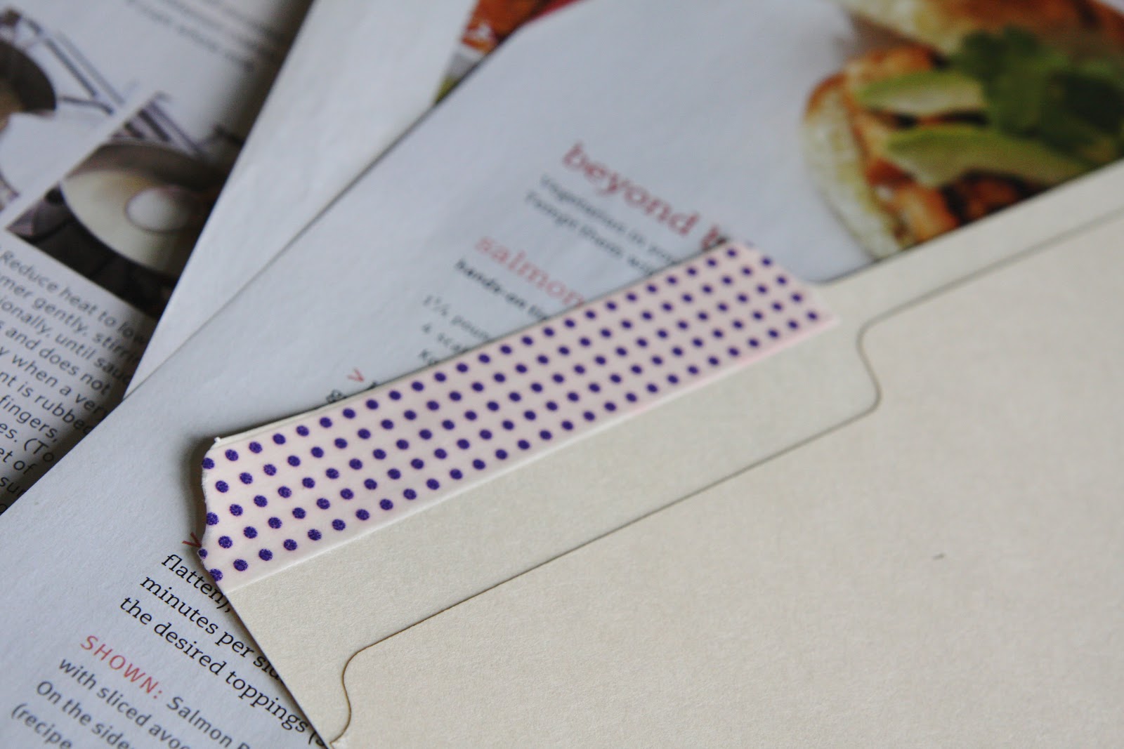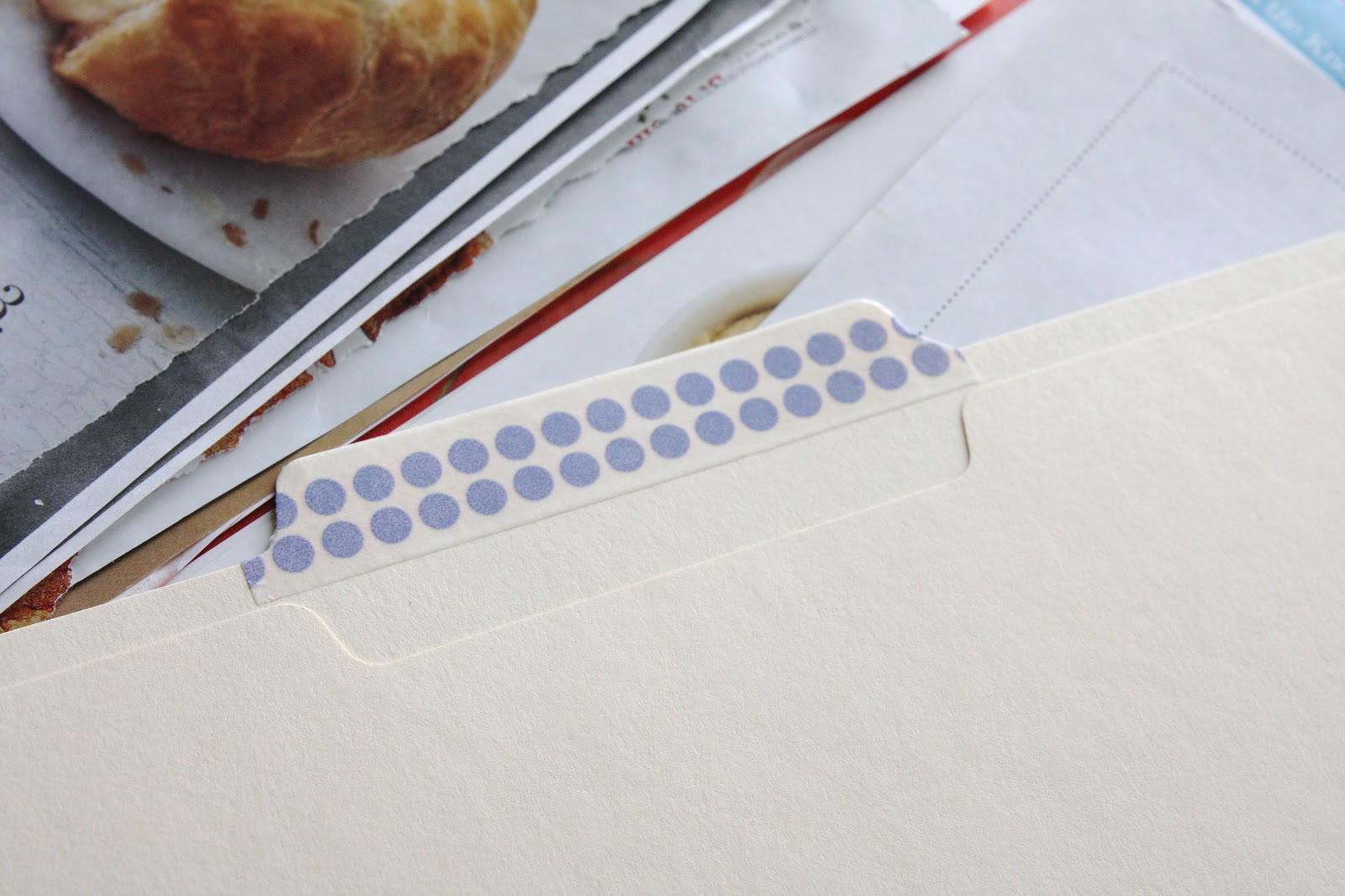 Now that I had my categories and all of those yummy recipes sorted, I created pretty labels for each folder using washi tape and a clear label…