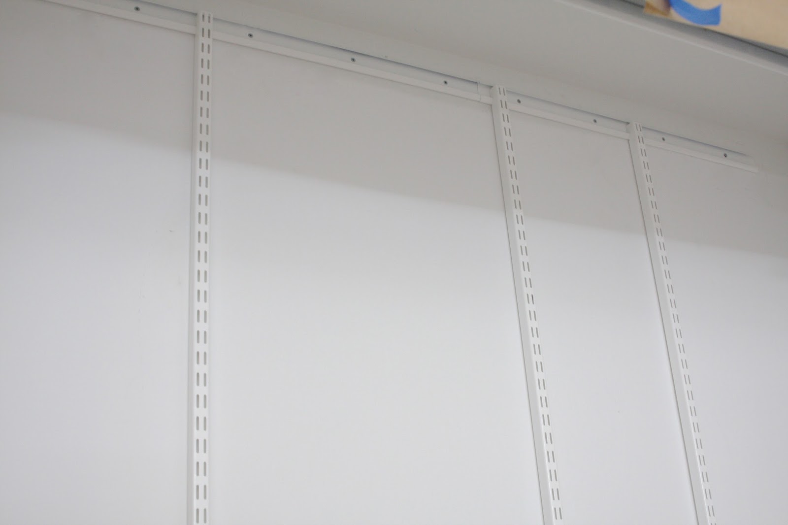 To install these systems, all you need to do is locate and mark your studs, then hold up the horizontal hanging bar, make sure it’s level and drill it into place. This step is helpful when you have an extra set of hands. One of my best friends from elementary school was here to help my dad. They installed the top horizontal bar and I followed up behind them adding the vertical bars and shelving…